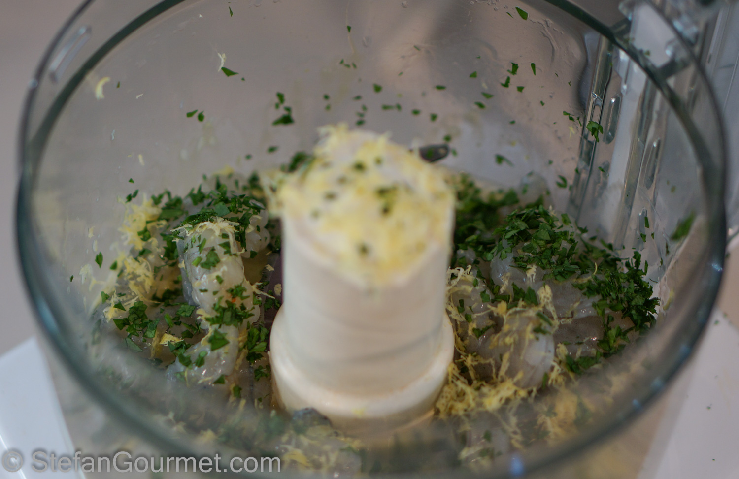 Add shrimp meat, 1 Tbsp fresh thyme leaves, and the zest of 1 lemon.