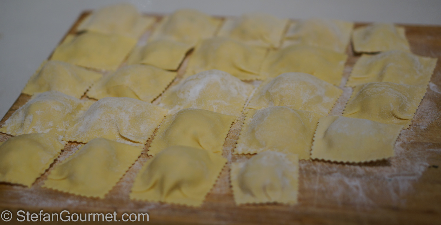Homemade ravioli are my specialty. I love to serve them at dinner parties and delight my guests with those parcels of delicate pasta with a scrumptious stuffing. The keys to good ravioli are to make the pasta as thin as possible, to make sure the parcels are closed tightly without any trapped air, to give the stuffing an interesting texture, and to slight over-season the stuffing. Good ravioli hardly need a sauce — some extra virgin olive oil, some melted butter with sage, or a simple thin tomato sauce will do.