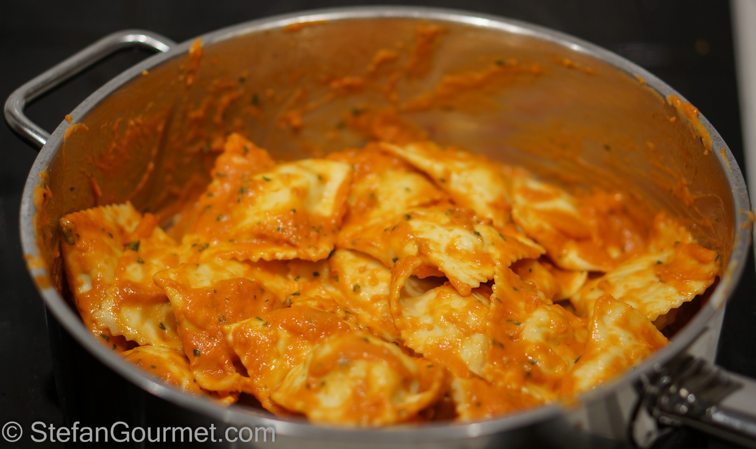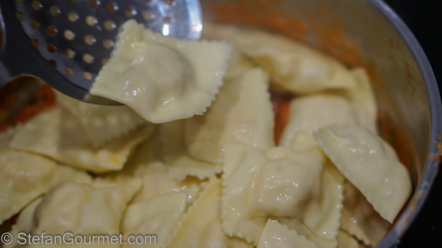 Transfer the ravioli to the pink sauce