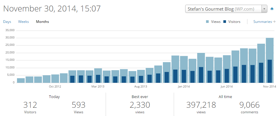 The average number of daily views has been steadily increasing from 12 in December 2011 to 212 in December 2012 to 461 in December 2013 and over a 1000 in the last month! The increasing number of views is nice, but it is the interaction with you all that keeps me going. So please leave comments and ask questions! I especially love hearing about it if you have tried a recipe from my blog. That really makes my day.