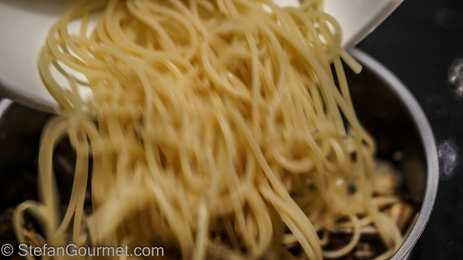 When the timer beeps, drain the spaghetti and add to the clams.