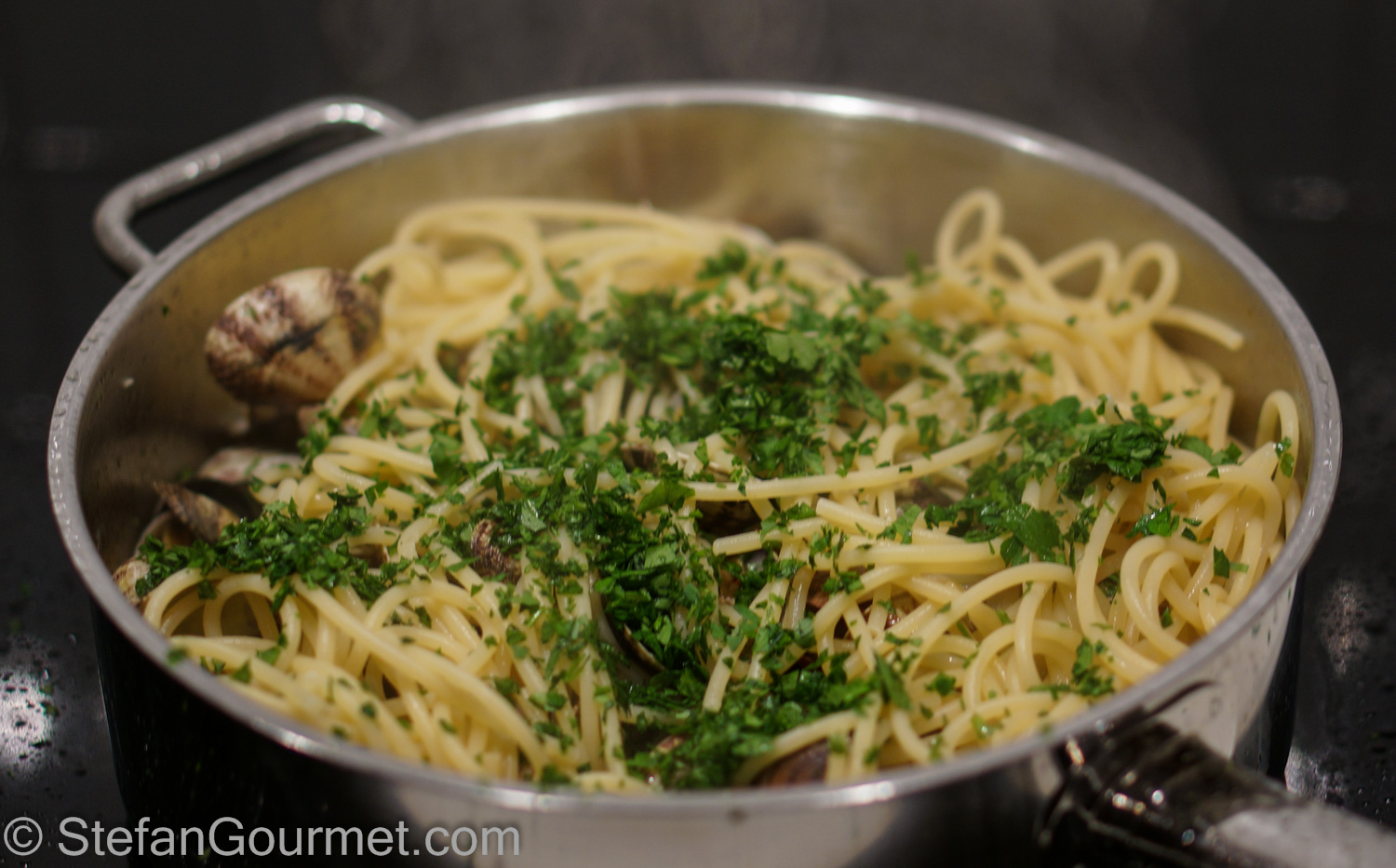 Toss the spaghetti with the clams over high heat for 2 minutes, or until the spaghetti has absorbed most of the juices.