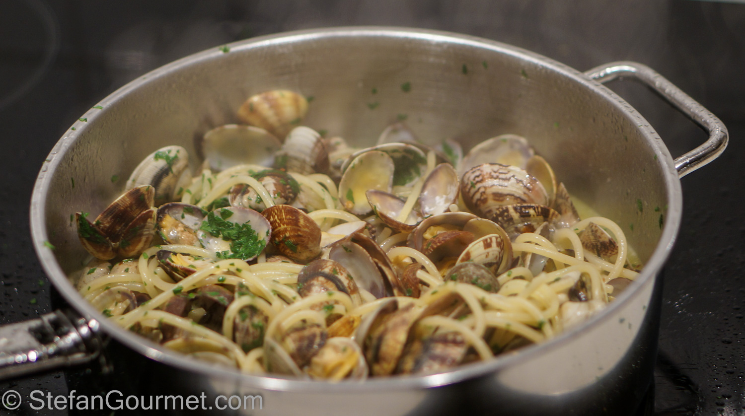 Although this dish originally hails from Napels, it is prepared all along the long Italian coast. Most common varieties are with or without white wine and with or without tomatoes (versione rossa o bianca (red or white version)). I like it white, with a bit of white wine to make it easier to open up the clams without burning the garlic.