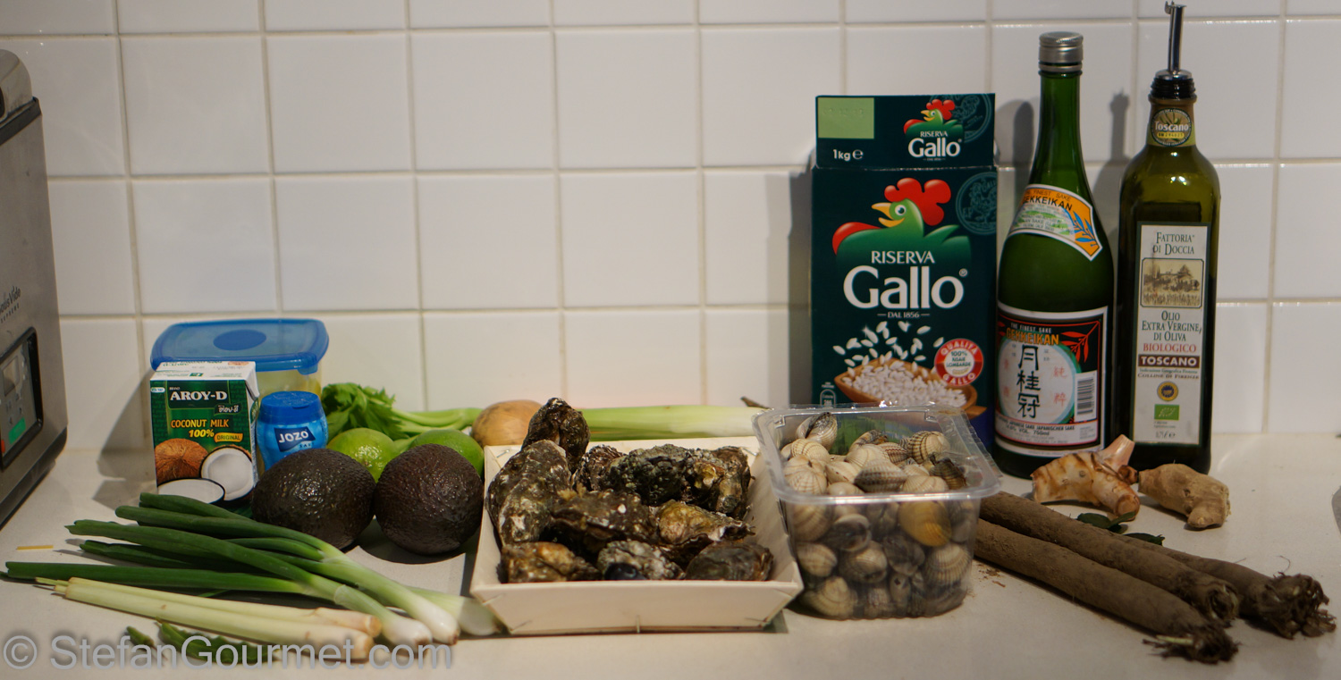This somewhat eclectic dish came about when Teun and I were playing in the kitchen and decided to get some inspiration from the Plated Dishes volume of Modernist Cuisine. More and more I am getting the impression that these dishes have been designed to demonstrate complicated techniques and to look amazing, than to actually taste really great. A dish that caught our interest was “Oyster stew” with a Thai-flavored oyster consommé, salsify, avocado and tapioca pearl. Since we didn’t know where to find tapioca pearls and thought a cold consommé would be more suited for summer, we decided to make a fusion risotto instead, using the same ingredients.