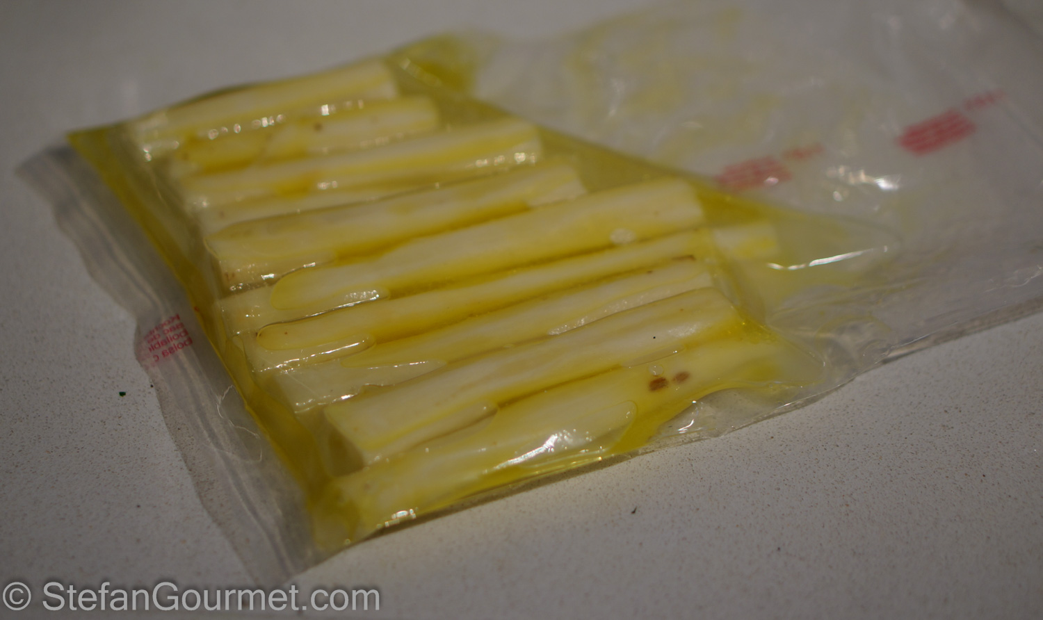 Drain the salsify and vacuum seal them with a bit of water, extra virgin olive oil, lime juice, and salt.