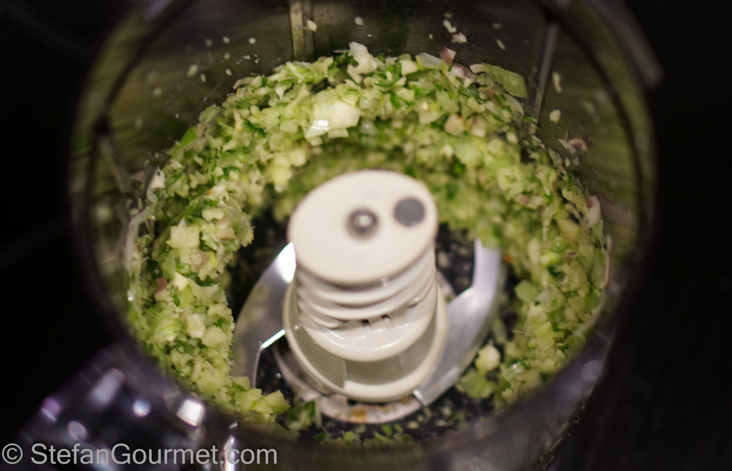 Mince the galangal, lemon grass, ginger, scallions, and bird chilli very fine in a blender.
