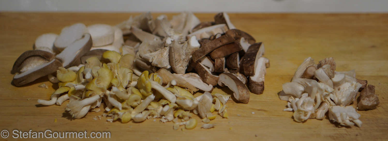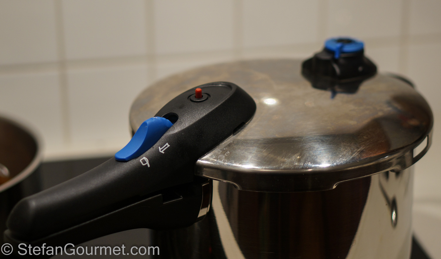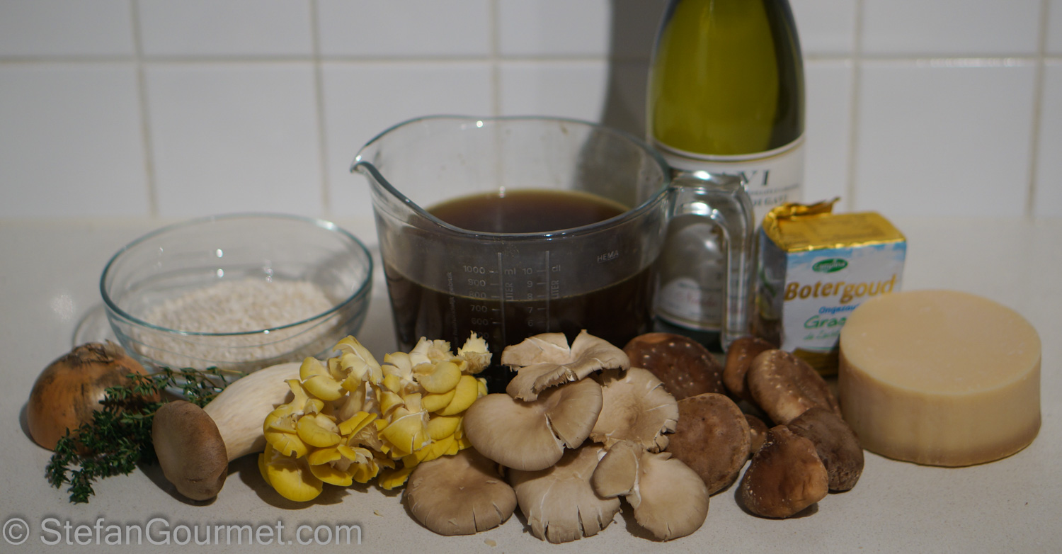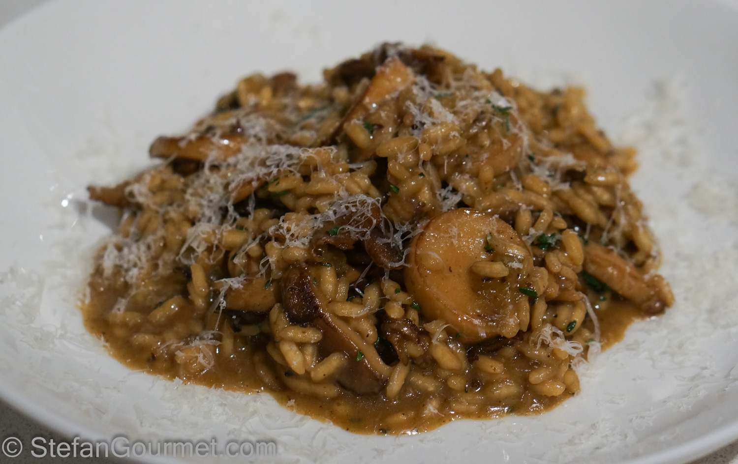My friend Jeroen swears by pressure cooked risotto, which according to him is quicker and just as good. I gave this a try and since I had some leftover mushroom stock from when I made truffle risotto, I decided to prepare a mushroom risotto. It is indeed quicker: from the moment I added the onion to serving took only 20 minutes instead of the usual 35. I think I could shave off up to 4 minutes by perfecting the amount of stock and the cooking time. As this was the first time I prepared it and you can’t check the rice while it is being pressure cooked and I didn’t want to risk overcooking the risotto, I pressure cooked it for 5 minutes at low pressure. The rice still needed another 5 minutes of regular cooking after that, so next time I will use a slightly longer cooking time. The exact cooking time will depend on the type of rice, so if you switch types (carnaroli, arborio, etc.) or even brands you may have to recalibrate your pressure cooked risotto recipe.
