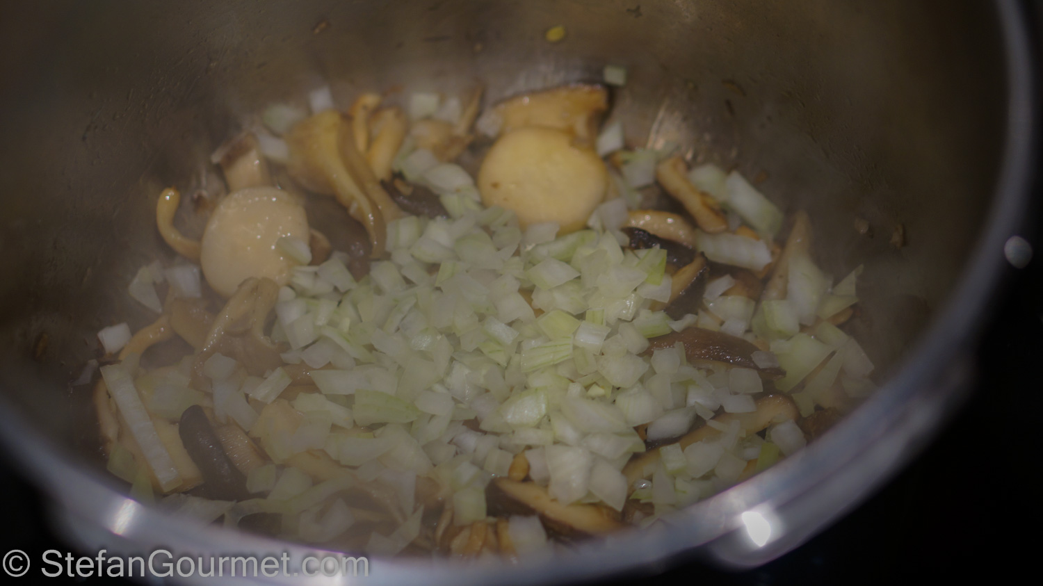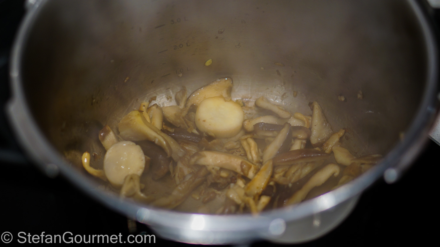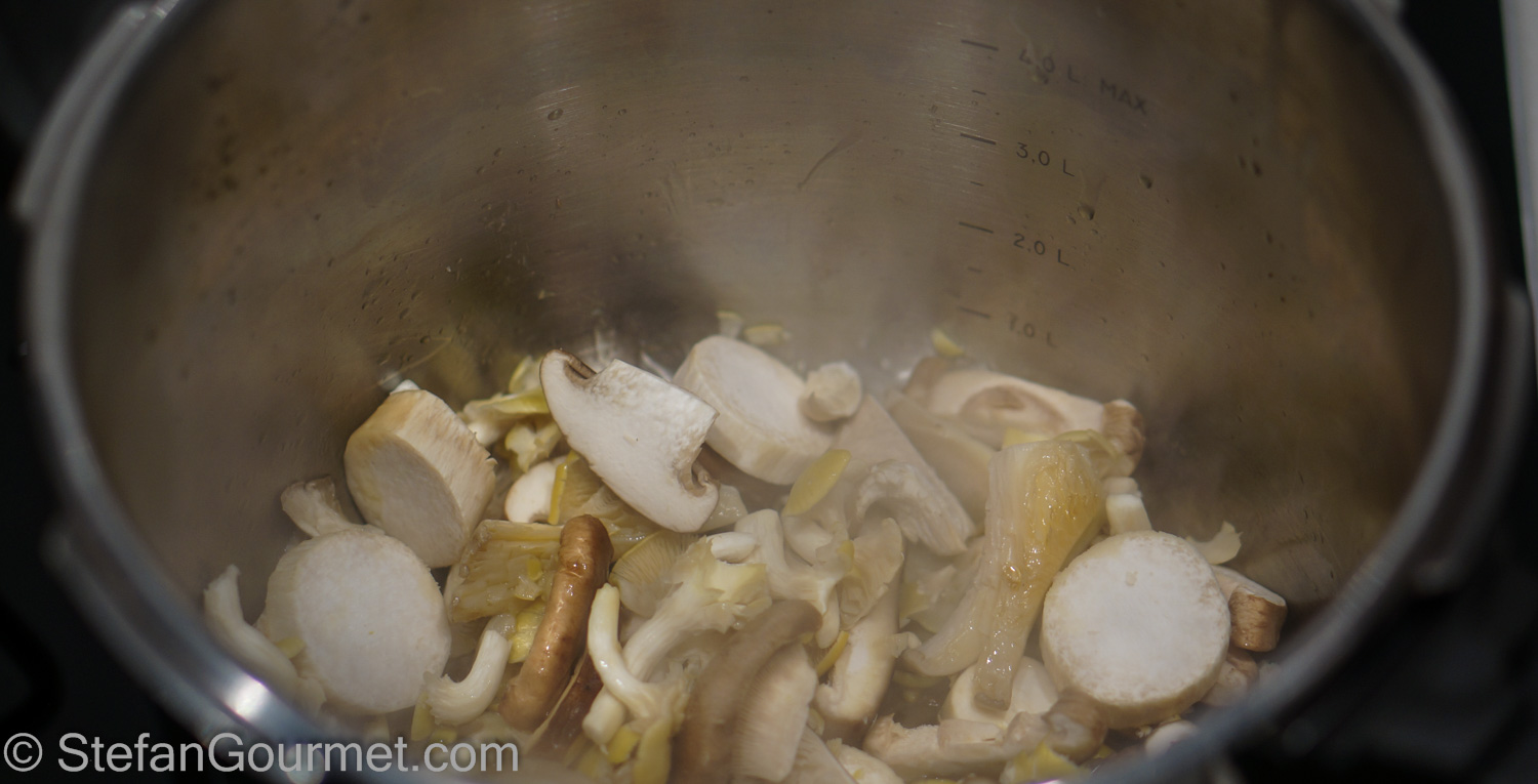 Heat 40 grams (3 Tbsp) of the butter in a pressure cooker and add the mushrooms. Season with a bit of salt and sauté over medium high heat.