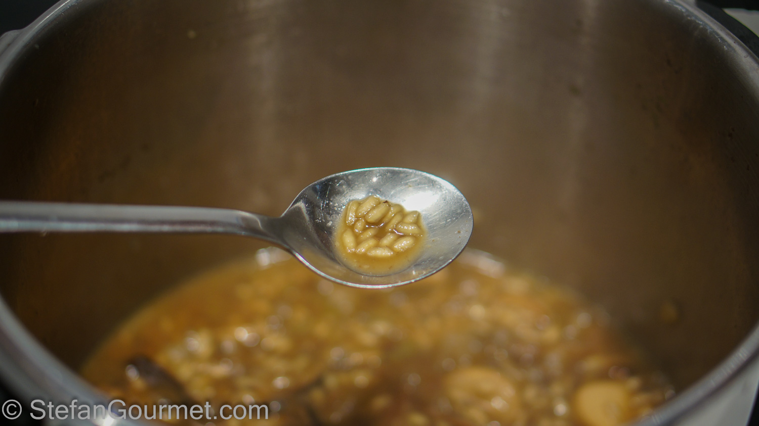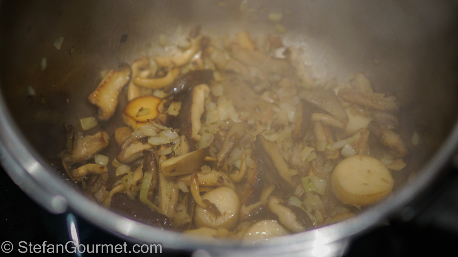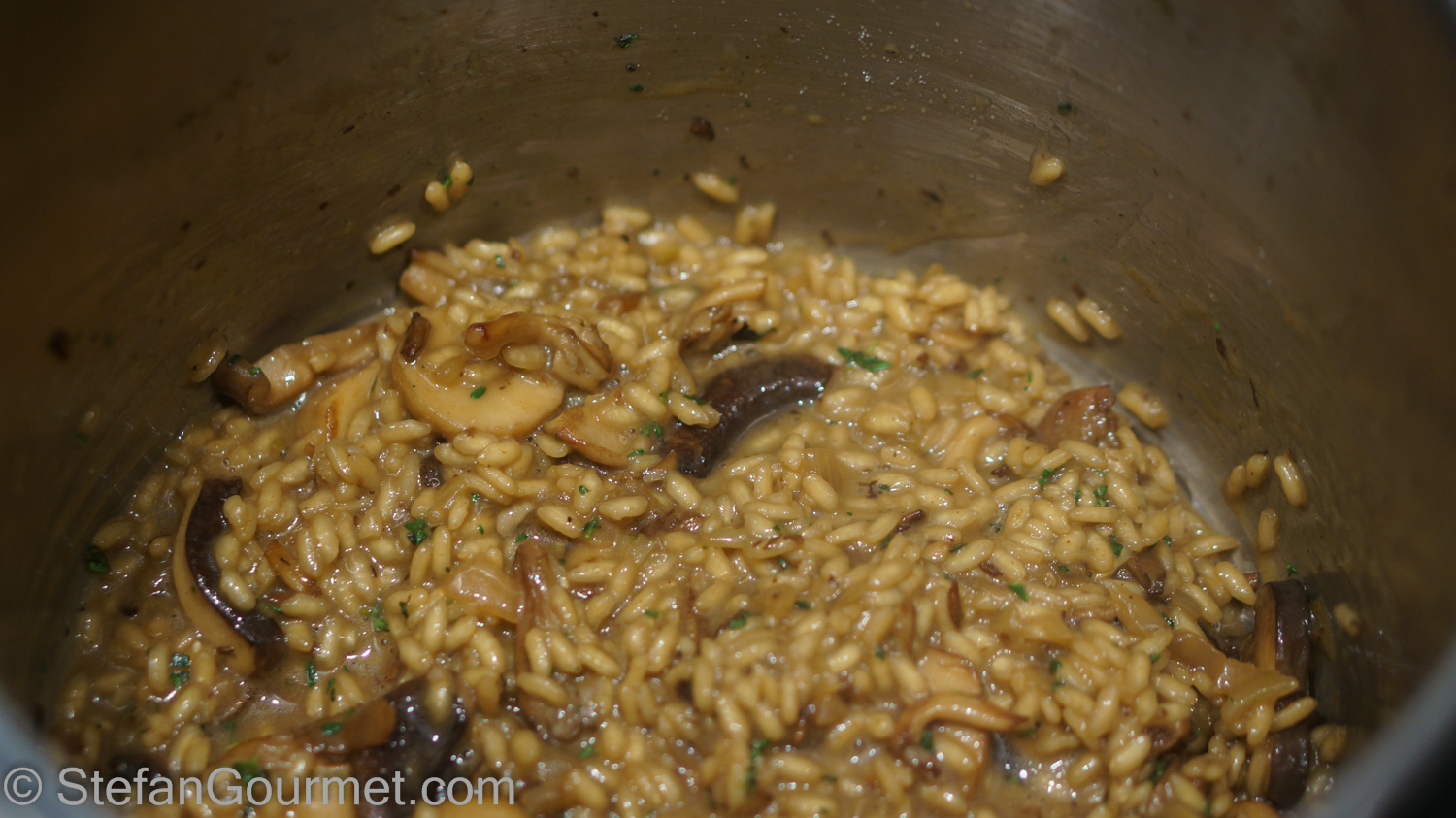 In my case the rice wasn’t cooked yet, so I cooked it, stirring, over medium heat until the rice was cooked to my liking. I even had to add some of the remaining mushroom stock.