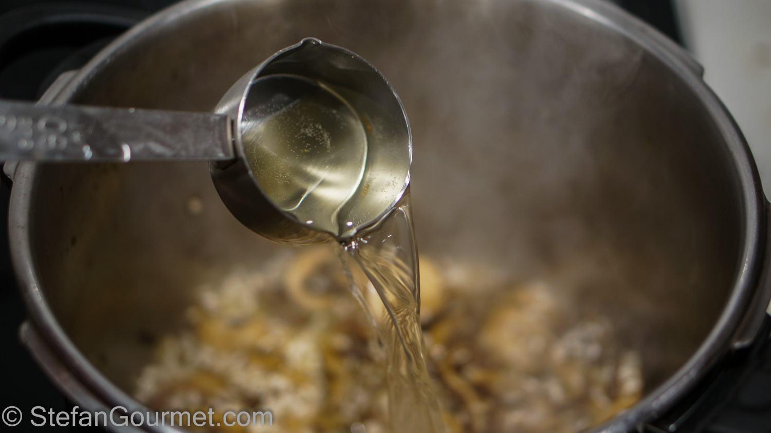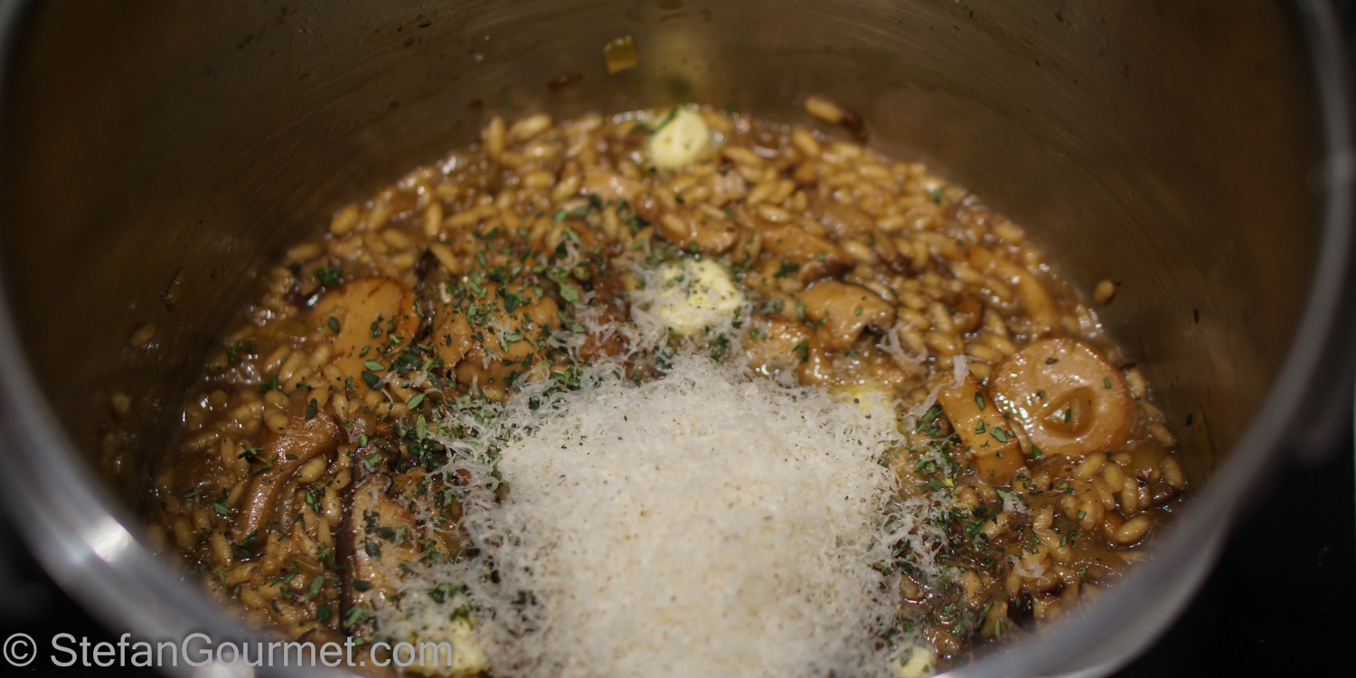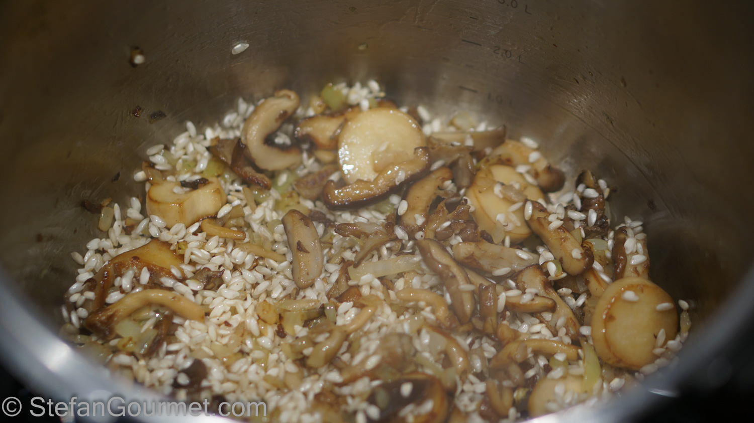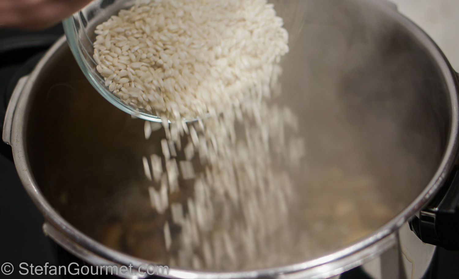 And what about the flavor and texture? Because you will use less stock as there is less evaporation, the stock needs to be reduced to achieve the same depth of flavor. To save time, I did this while I sauteed the mushrooms and toasted the rice. I’m confident the pressure cooked risotto ended up tasting the same as a regular risotto, even though I didn’t do a side-by-side comparison. And the texture? I did stir it for the additional 5 minutes of cooking, but it still didn’t have the texture that my ‘stirred’ risotto has. It was still very good though, and if you don’t stir your risotto anyway (and I know many of you don’t) you won’t notice the difference. So all in all pressure cooked risotto is a pretty good idea because it is significantly faster! Thanks, Jeroen.