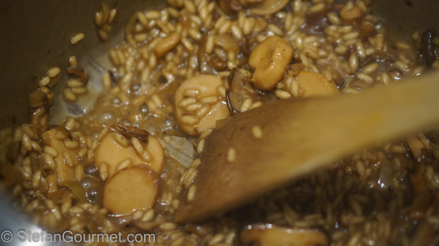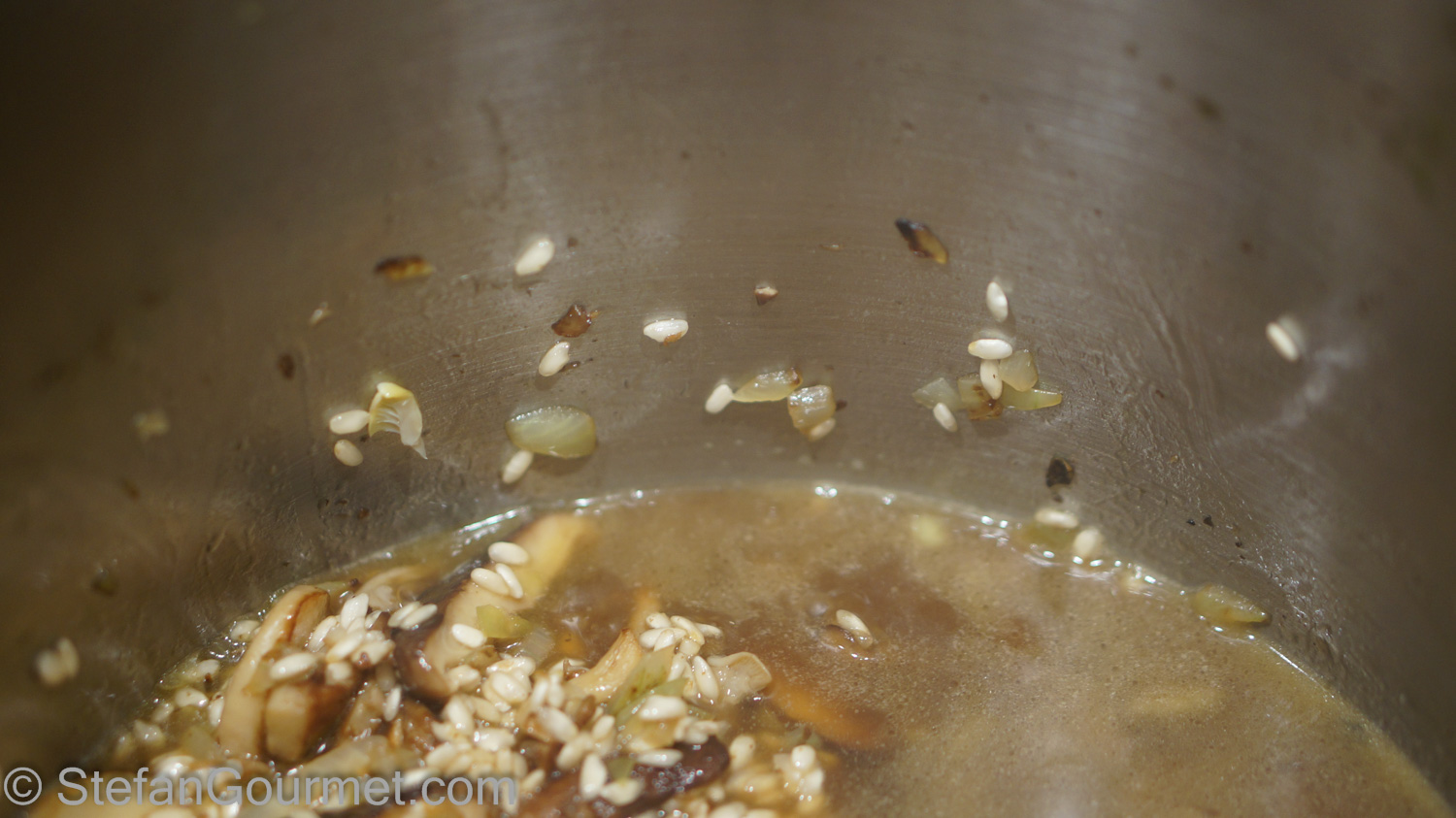 Now filter the mushroom trimmings out of the mushroom stock and add 320 ml (1 1/3 cup) of the hot mushroom stock to the rice all at once.