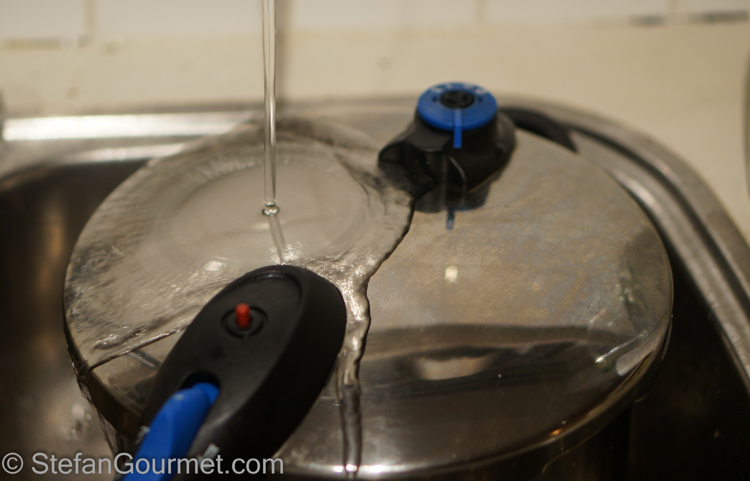 After those 5 minutes, run cold water over the cover to release the pressure quickly.