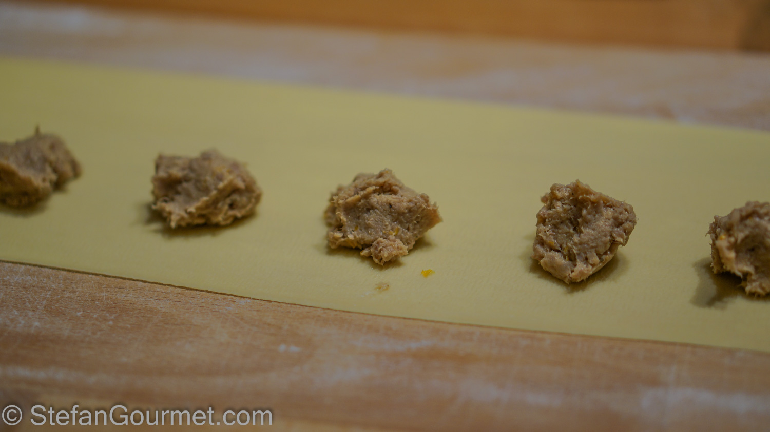 Arrange small heaps (teaspoon-sized) of filling on the sheet of pasta dough, just off-center, with about 2-3 cm (1 inch) space in between. You can do this either with two spoons, your fingers, or a piping bag.