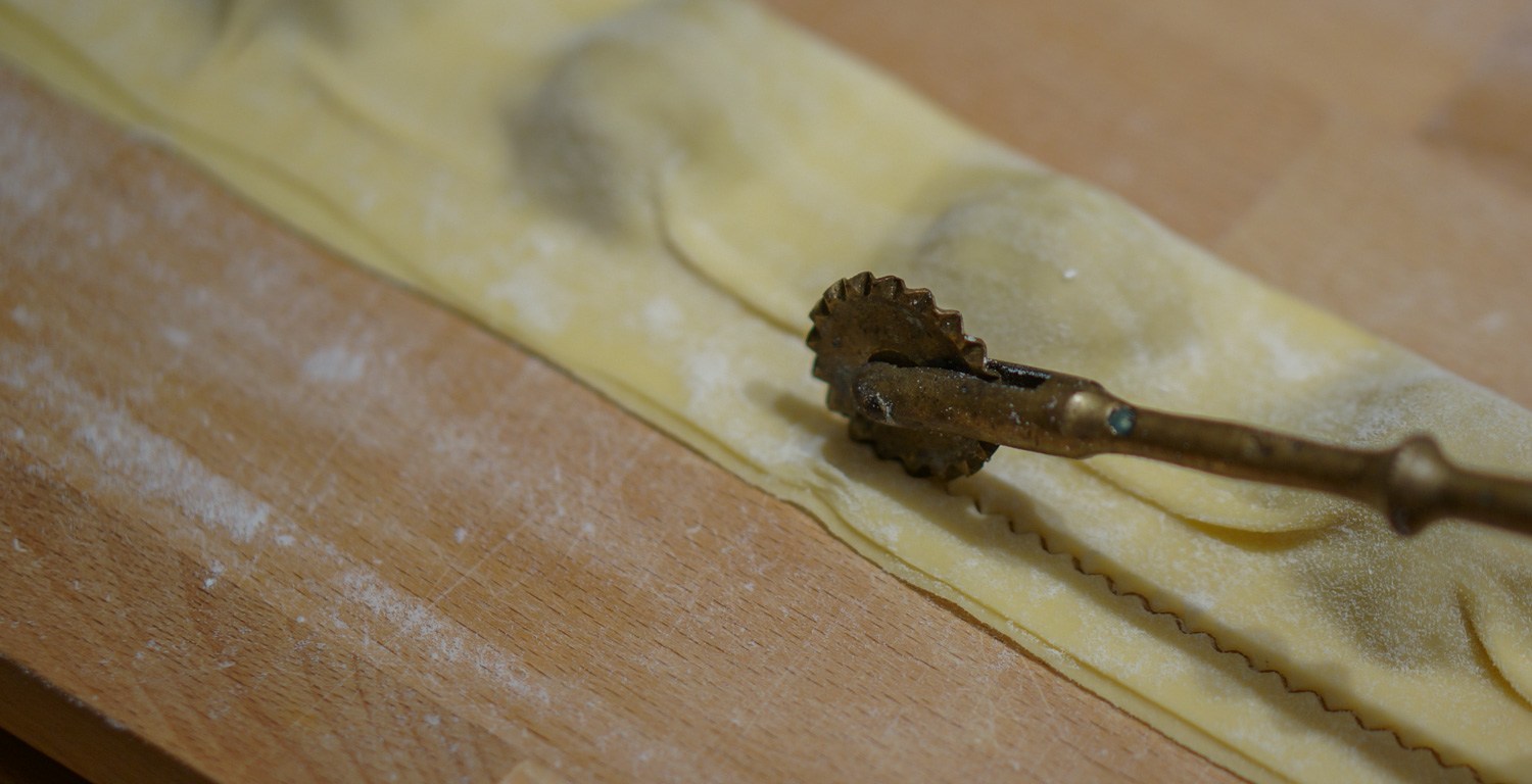 Using a scalloped pastry wheel serves two purposes: it will make the ravioli look pretty and because of the ‘bluntness’ of the wheel it will help sealing the ravioli.