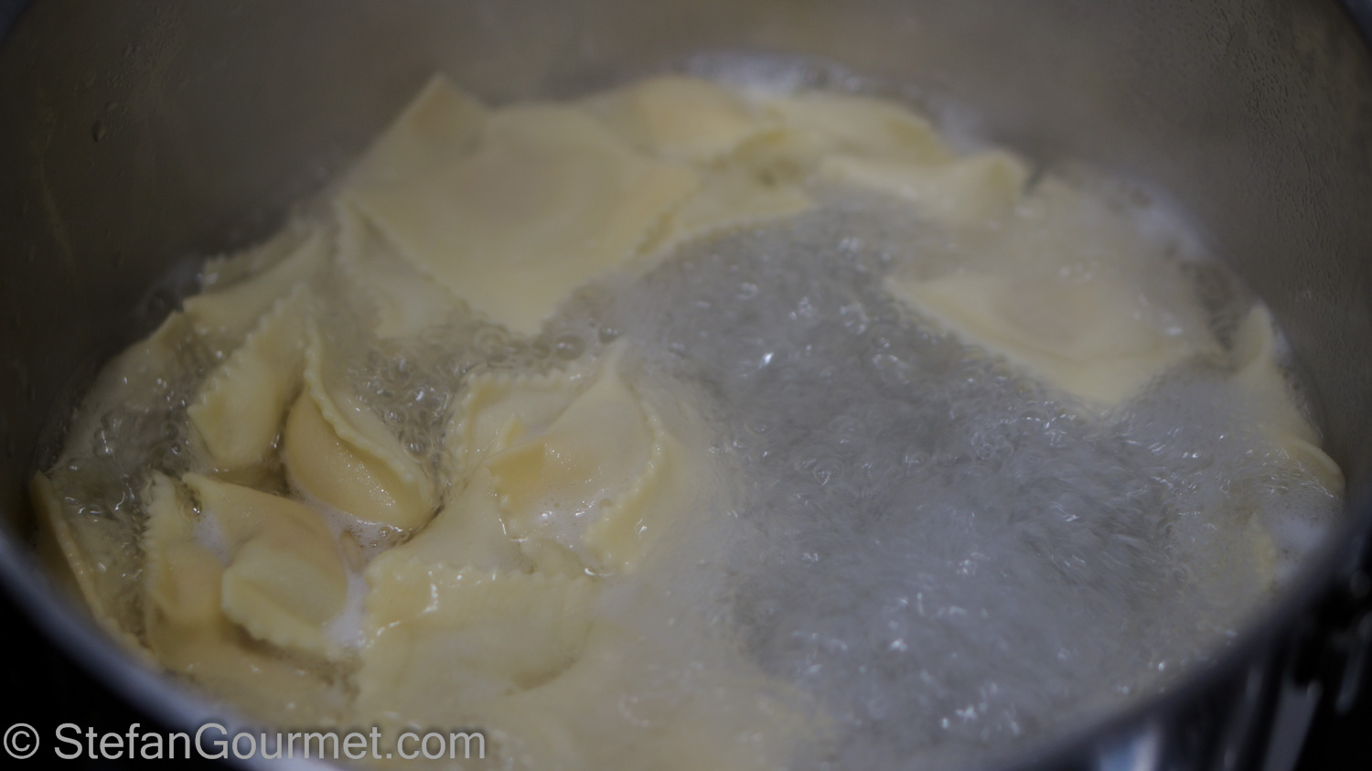 Because the dough is so thin, ravioli take only 1-2 minutes to cook in ample boiling salted water. If you cook them for too long, they may start leaking and the pasta will become too soft (no longer al dente).