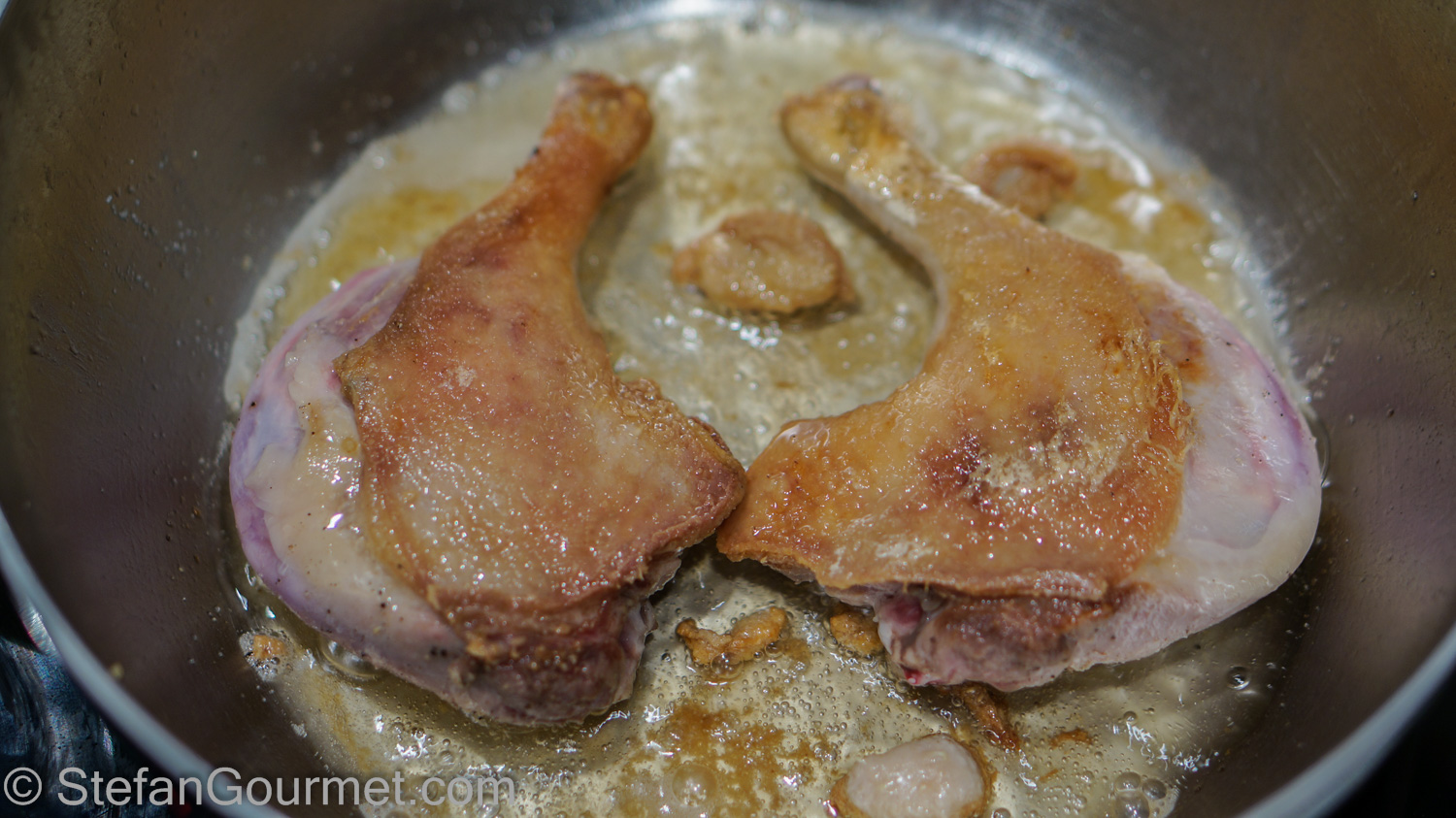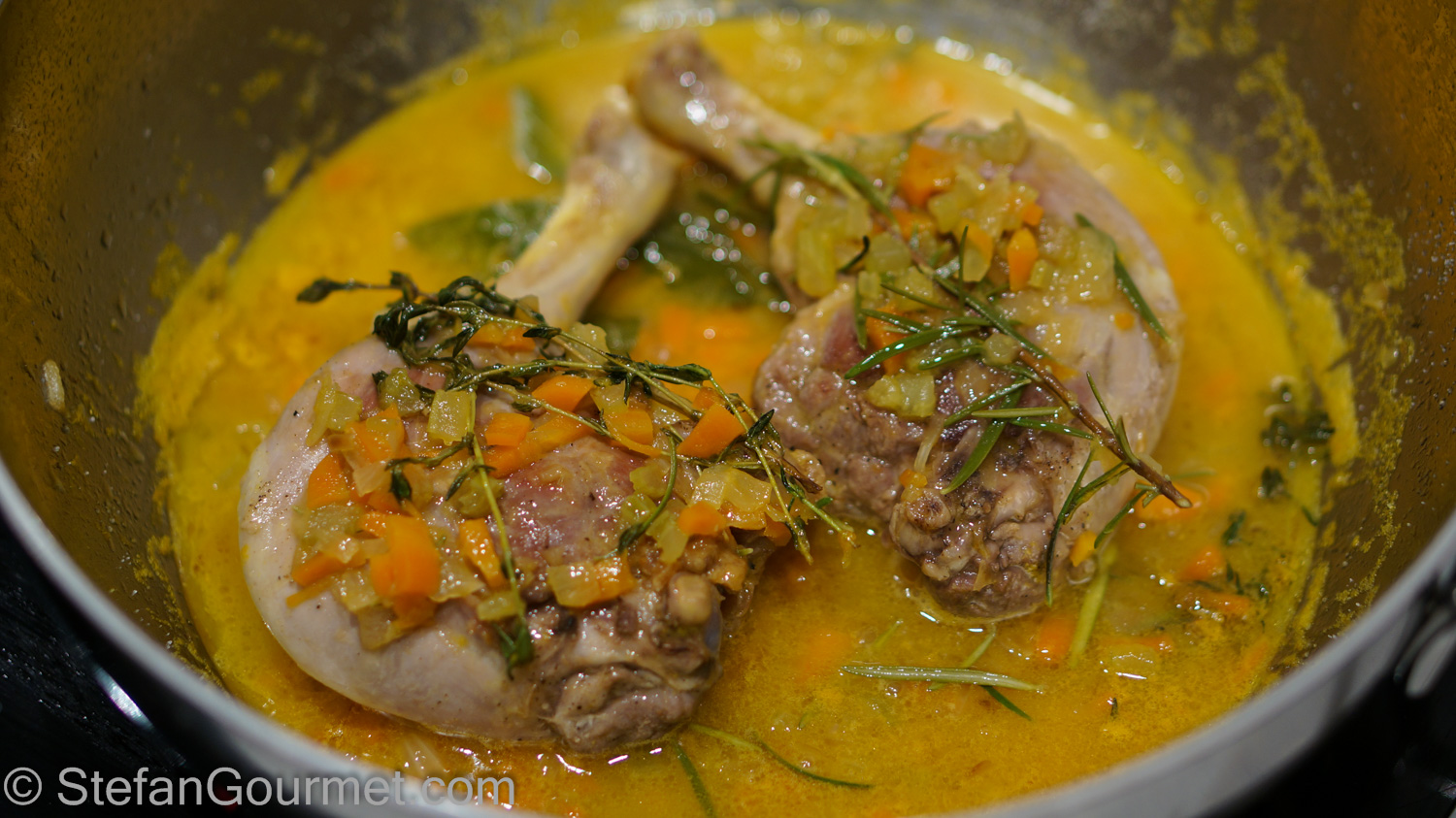 Add the duck legs including the juices that leaked out of them. We don’t want to waste any flavor!