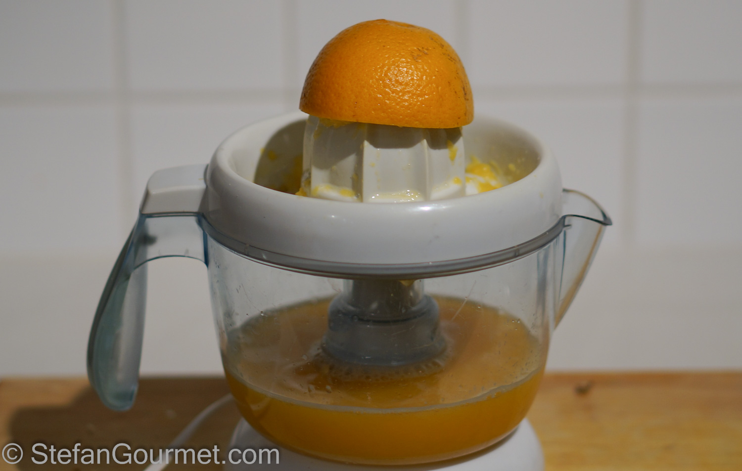 Meanwhile, squeeze the orange (remembering to zest 1 first, as it is difficult to zest a juiced orange).