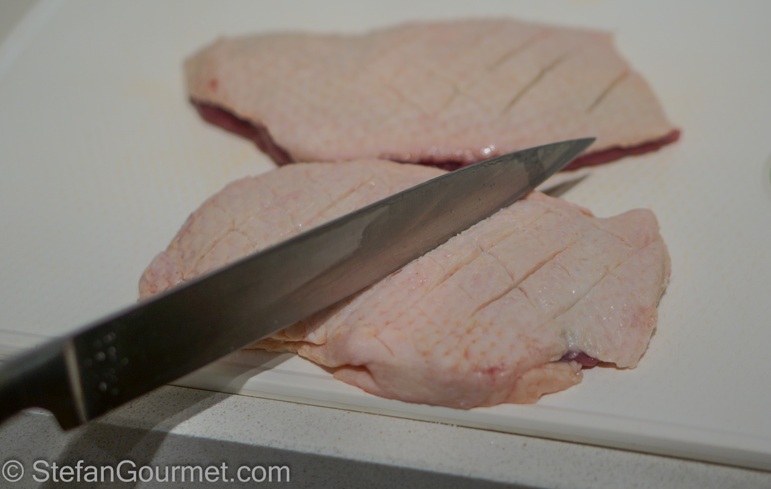 With a sharp knife, score the skin of the duck breast fillets in a diamon pattern. Try to avoid cutting into the meat, just the skin.