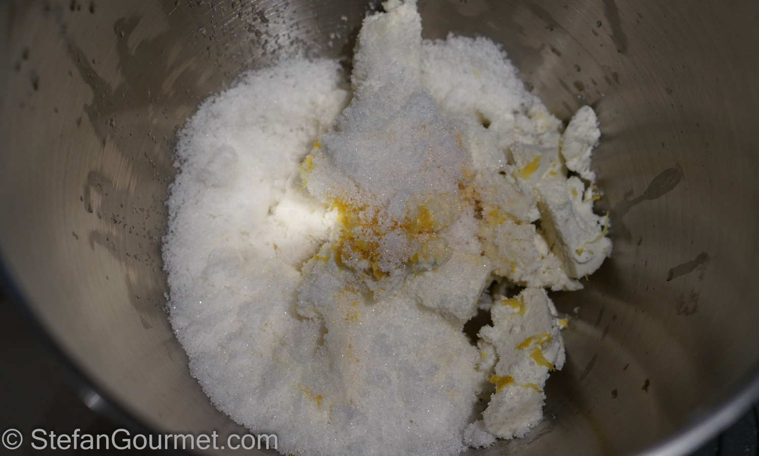 Combine the goat cheese, lemon zest, lemon juice, vanilla extract, and sugar in the bowl of a stand mixer. Mix (with the balloon whisk or the paddle) until creamy.