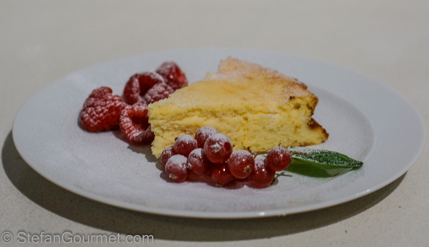 Serve with red berries, a mint leaf, and sprinkle with icing sugar.