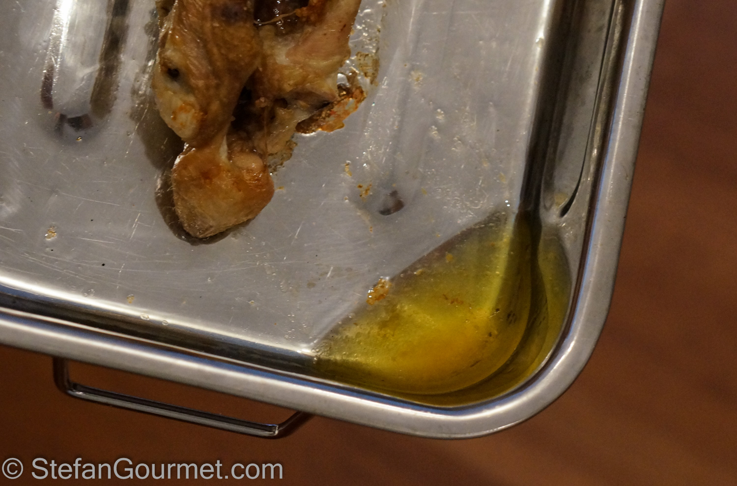 When the carcass has finished roasting, pour the fat out of the roasting dish.