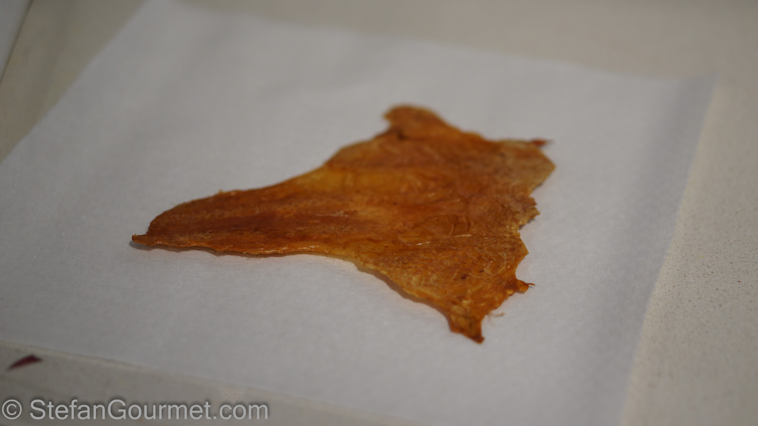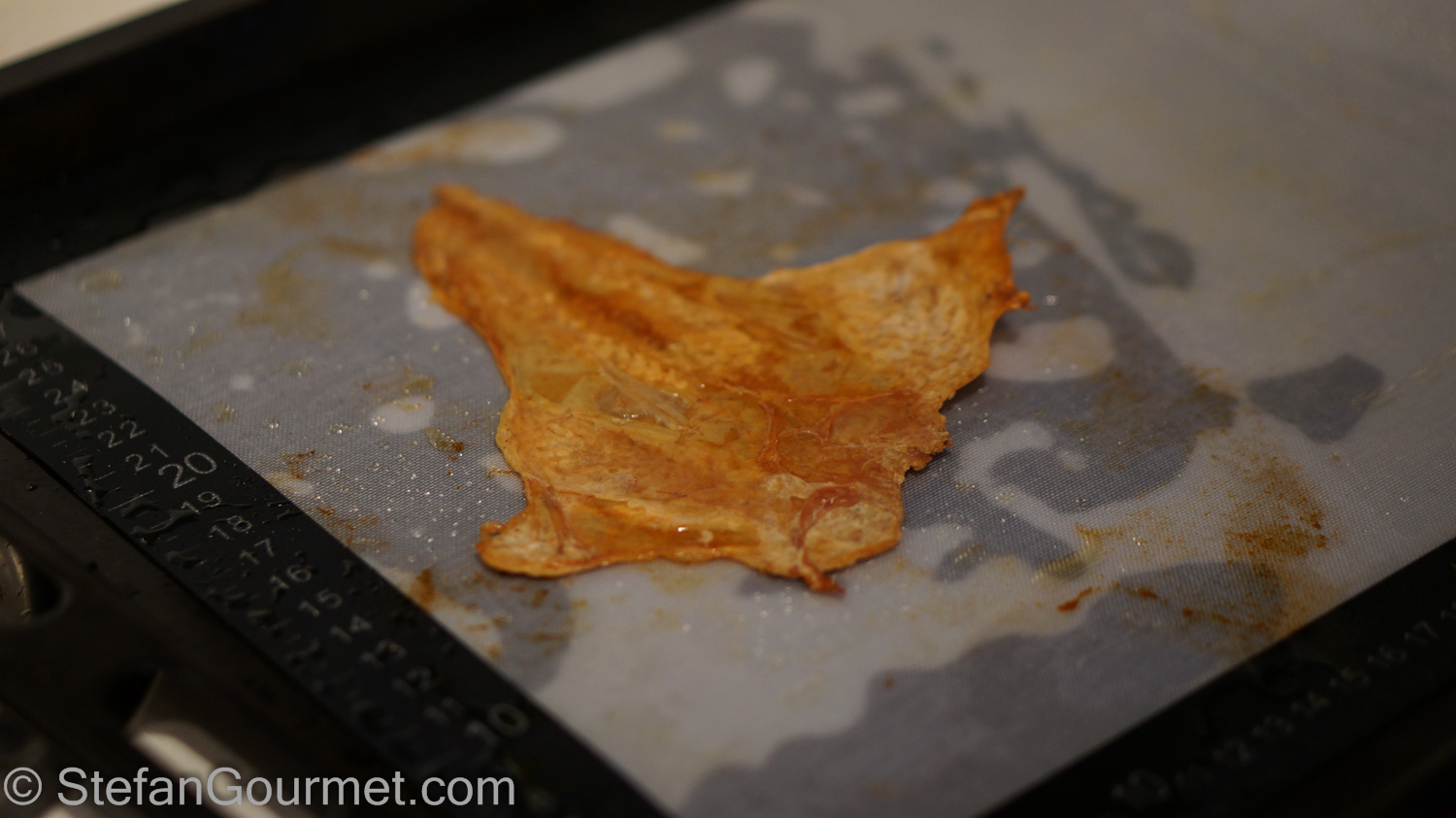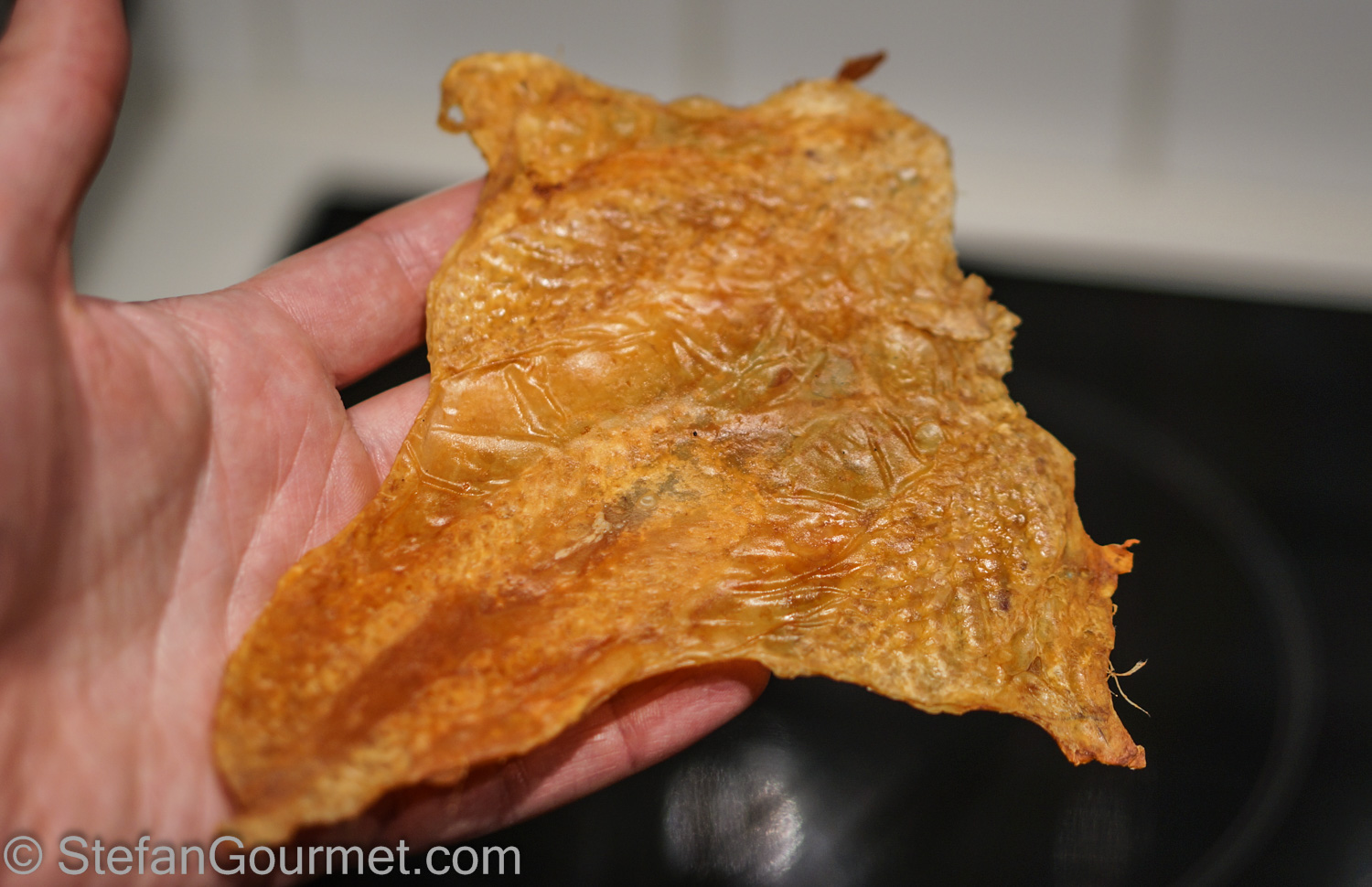 My dish is more simple than what was served at Devero. I couldn’t find yuzu, so I decided to use the most exotic citrus I could find instead, a bergamot orange. I wanted to garnish with green shiso leaves for color, but those were sold out.  I decided to allow the chicken stock to firm up so I could use it as a base for the crispy chicken skin to stand up. Of the bergamot orange I simply used the juice and zest. The dish ended up quite different from what we had at Devero, but very nice indeed with a good combination of flavors and contrast between textures. It’s nice that the dish is only made from three ingredients! (Not counting a bit of salt.) Here’s what I did…