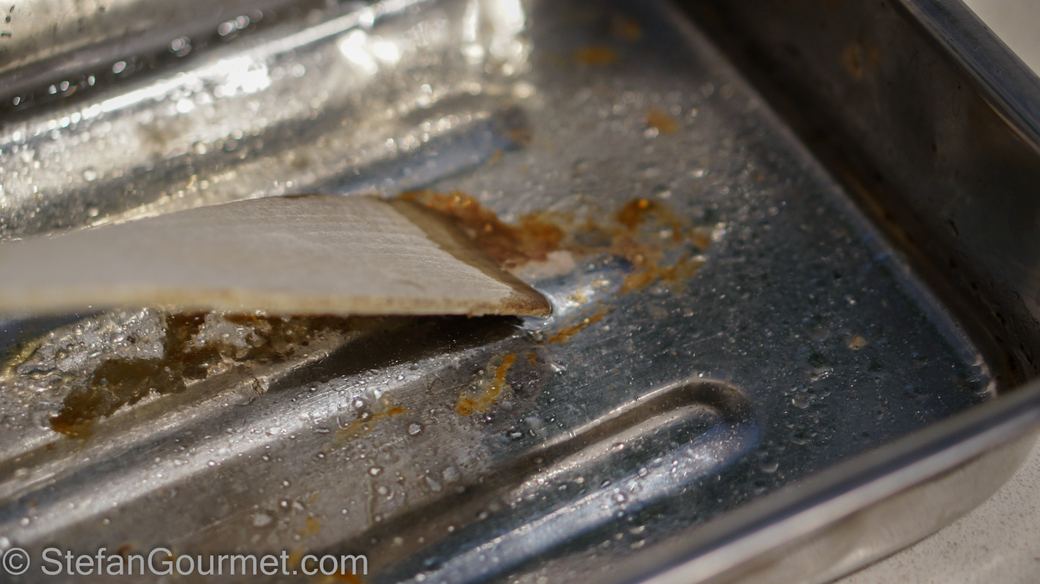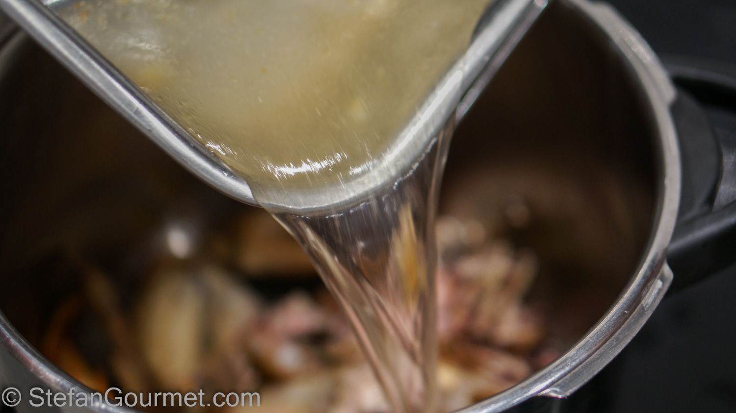 Then pour the water from the roasting try into the stock pot or pressure cooker.