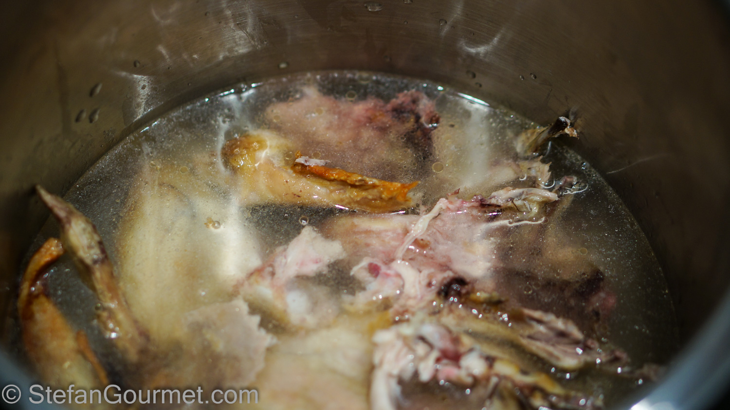 Take the roasted carcass out of the roasting tray and put it in a stock pot or pressure cooker. Add a litre (a quart) of water to the roasting tray and use a wooden spatula to release all the browned bits from the roasting tray so they will be included.
