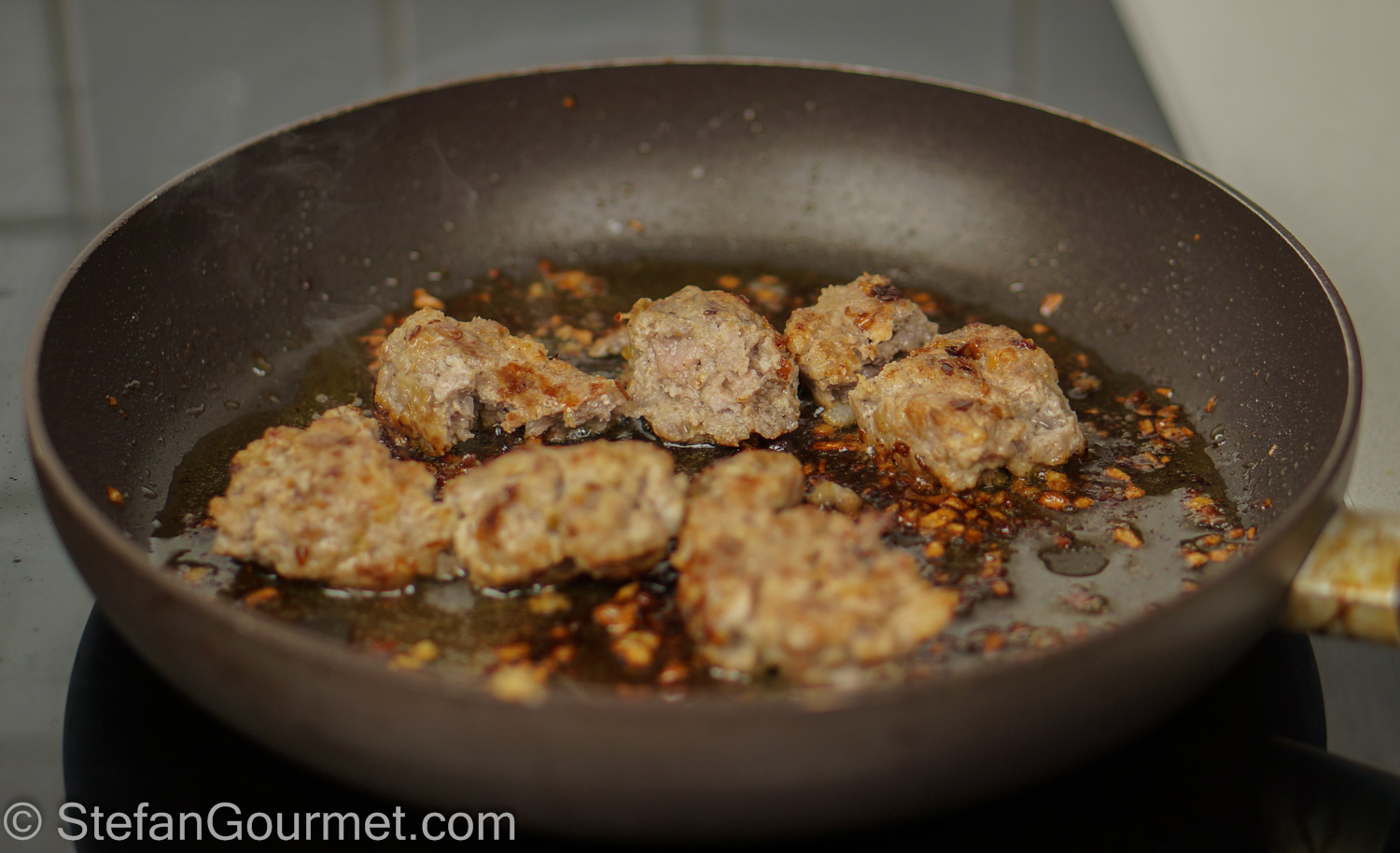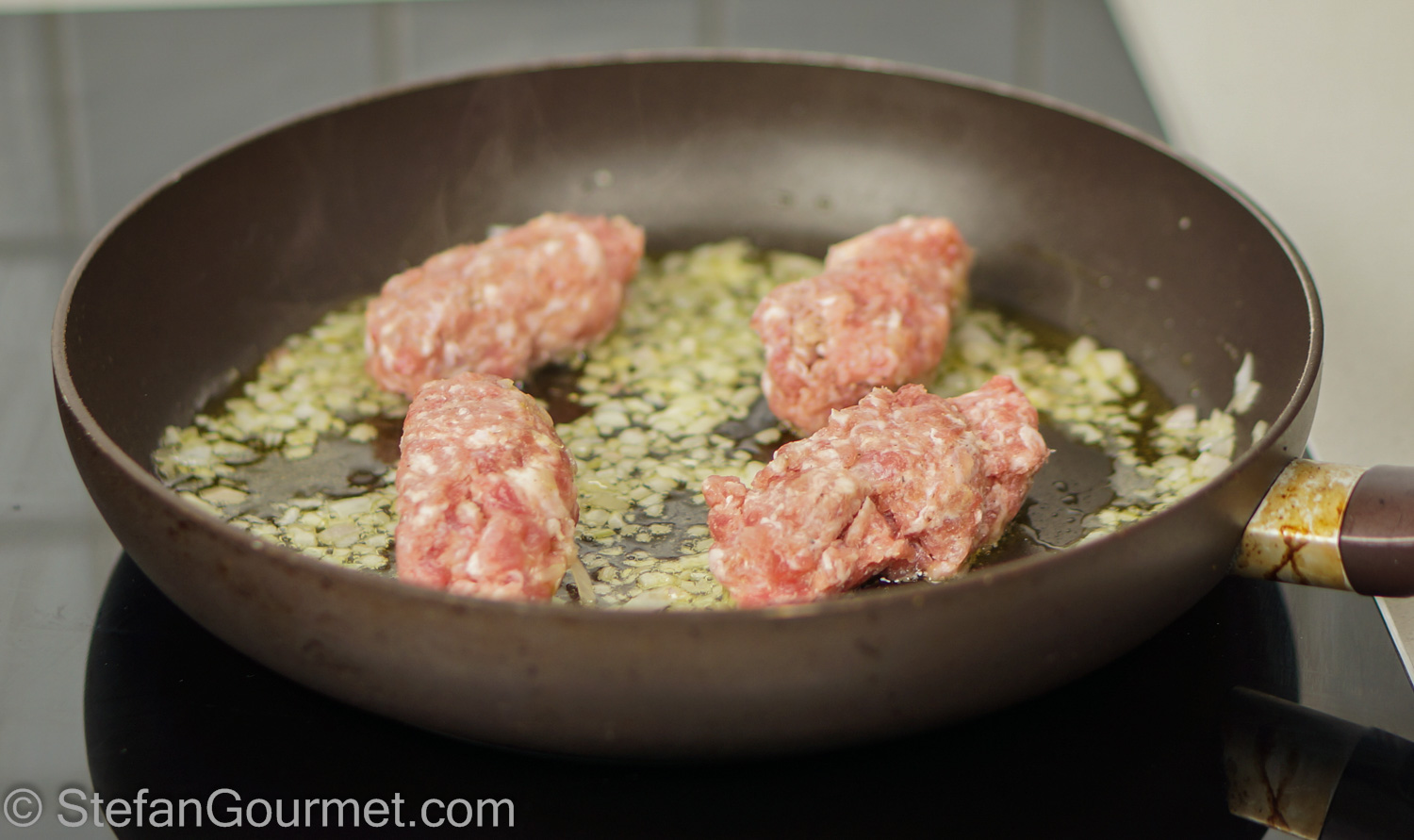 Cook over medium heat until the sausages are golden browned and just cooked through (you can check by breaking one in half with a spatula) and the shallot are golden but not crispy, about 10 minutes. (It may be tricky to cook the sausage and shallot in the same pan as the shallot may overcook before the meat is cooked. It is easier to cook them in separate pans.)