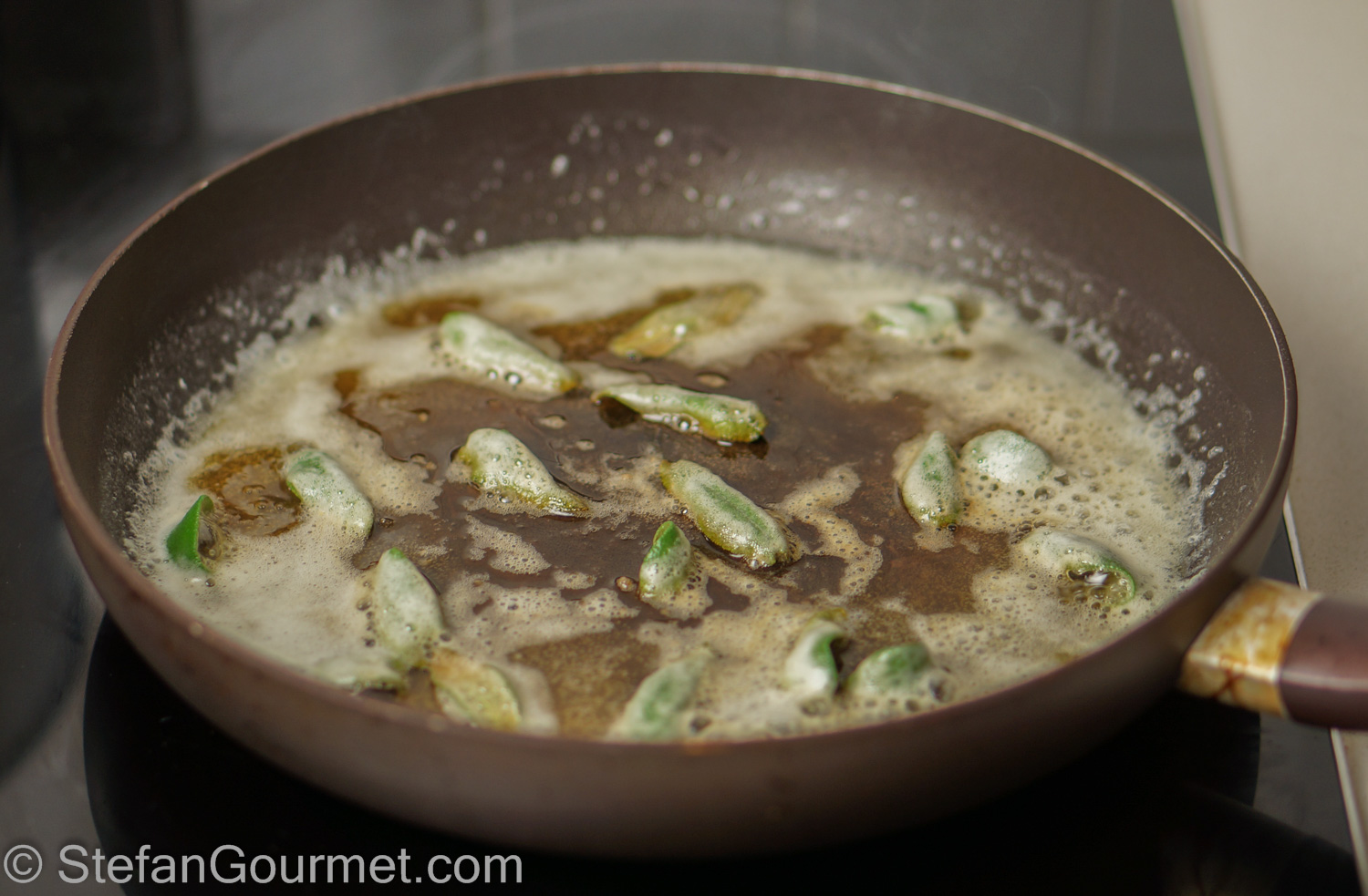 When the butter foams, add sage leaves. Cook for a minute, then turn off the heat.