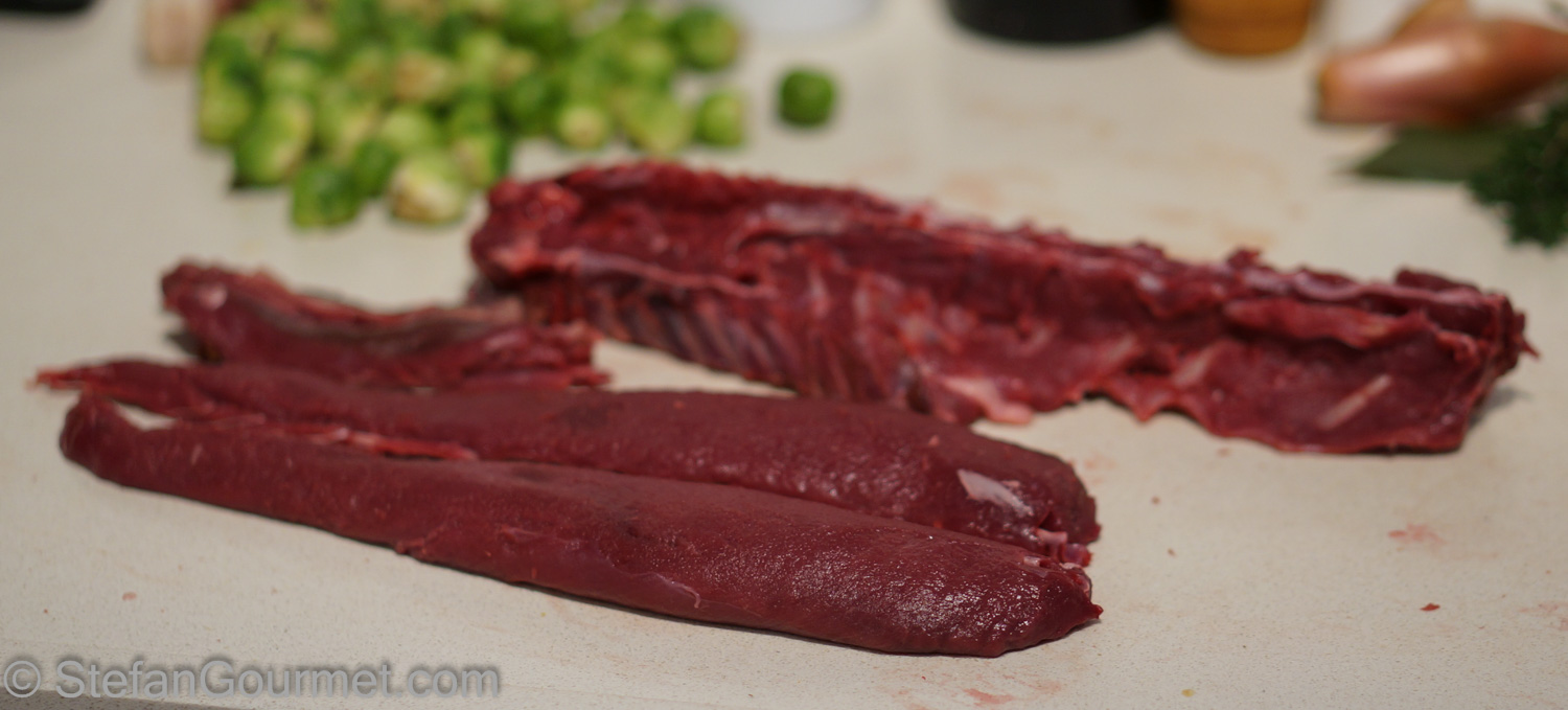 Unlike rabbit, hare is red meat and always wild as hare cannot be farmed. This gives the meat a deep flavor that can easily stand up to the strong flavors of sprouts, pancetta, and amarena cherries. Hare is unfortunately not commonly available in the US. Loin of hare should always be served on the rare side of medium rare as it otherwise will be dry and taste of liver/metallic. Here’s what I did…