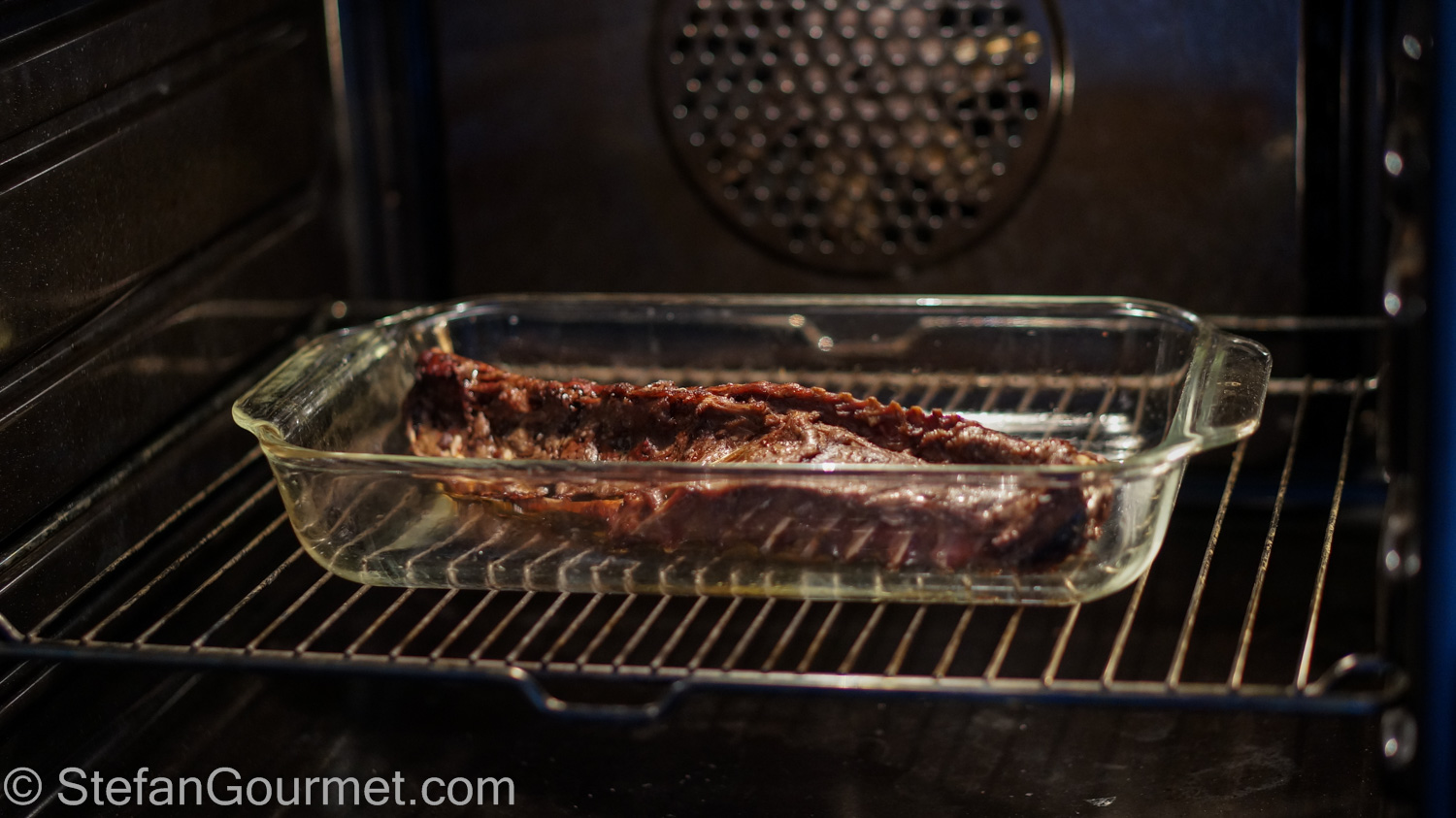 I love rabbit flank. but I do not agree at all with Thomas Keller’s recipe to cook it for 12 hours at 74C/165F! The flap meat was very tender and juicy after cooking it sous-vide for 3 to 4 hours at 60C/140F. There are more strange times/temps in that book.