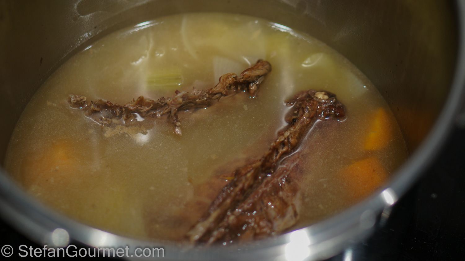 Bring the hare stock to a boil, then reduce the heat to a nice simmer…