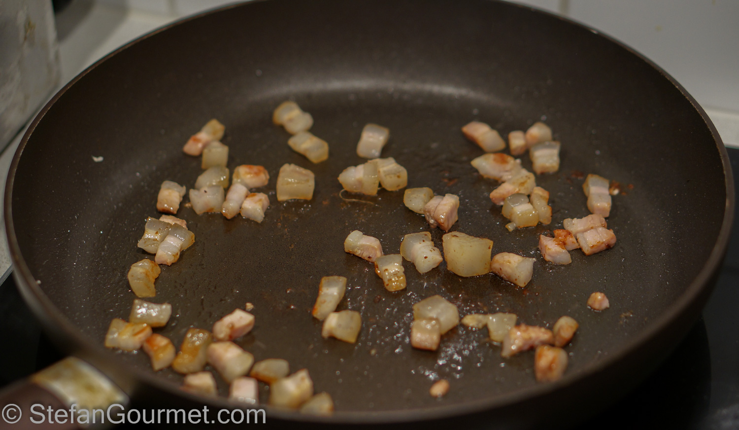 Meanwhile, fry the diced pancetta in a non-stick frying pan over medium heat without adding any fat. Stir now and then until the pancetta is starting to get golden and some fat has rendered from it. Then toss with the brussels sprouts. Taste and adjust the seasoning with salt and freshly ground black pepper. Keep warm over low heat.