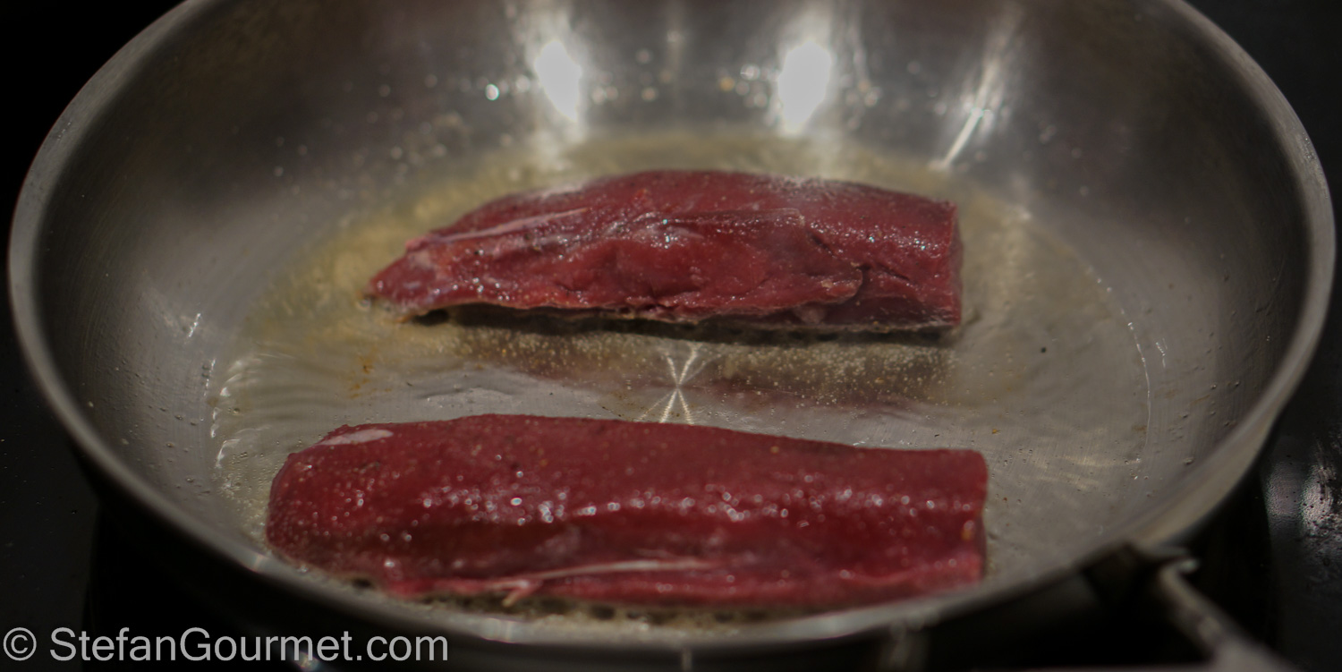 Melt the clarified butter in a frying pan. Brown the hare loins in the clarified butter over high heat.