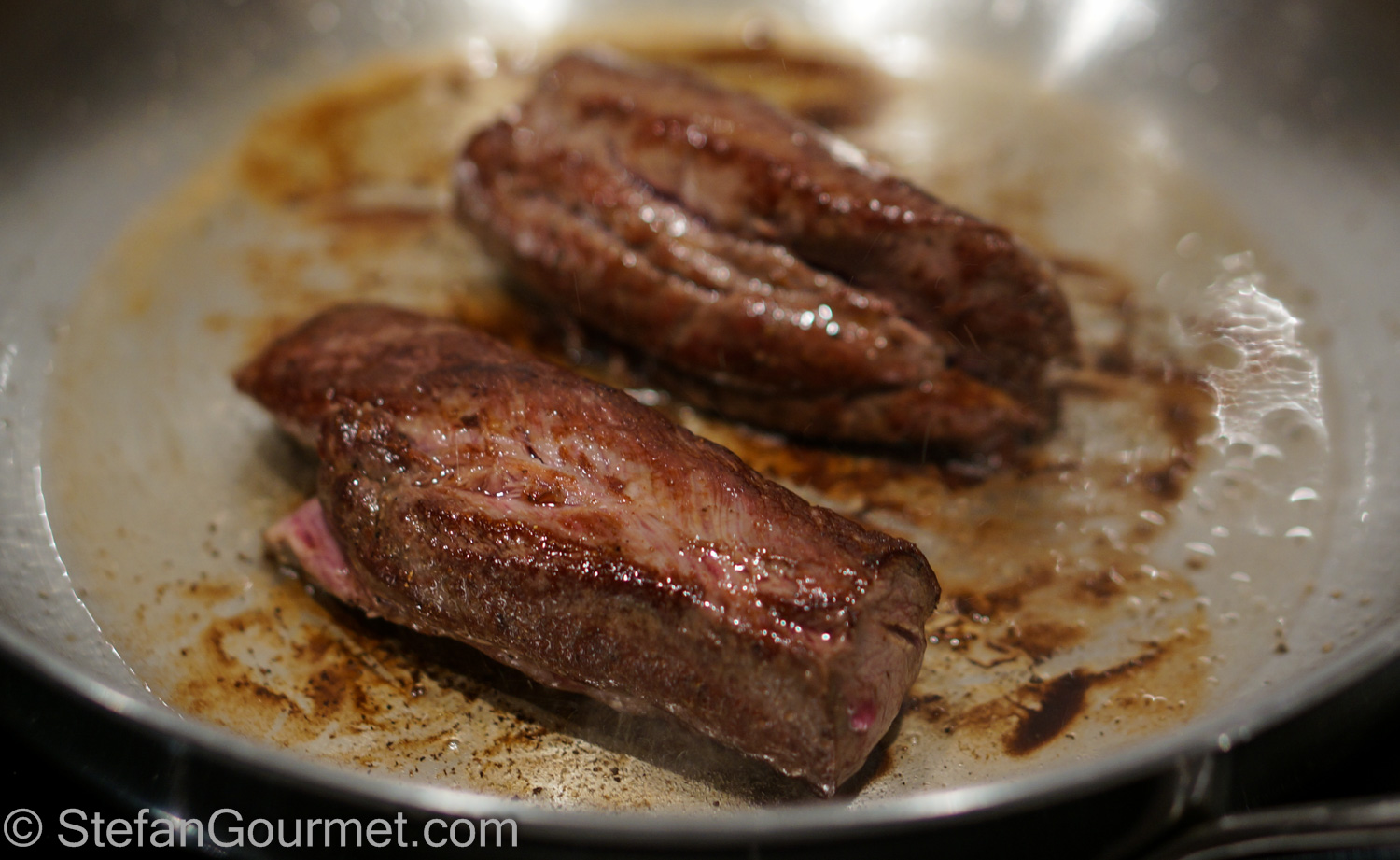 When the loins are nicely browned on all sides, insert the probe of a meat thermometer such that the tip of the probe is in the center, and cook in the oven until the core has reached a temperature of 55ºC/131ºF. Then wrap in aluminum foil to rest.