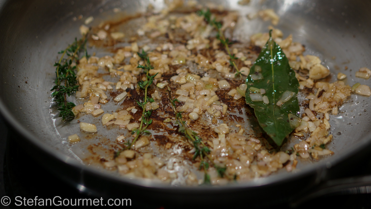 Add the shallots, garlic, bay leaf, and thyme to the pan in which you browned the hare. Cook over medium heat until the onion and garlic are golden but not brown.