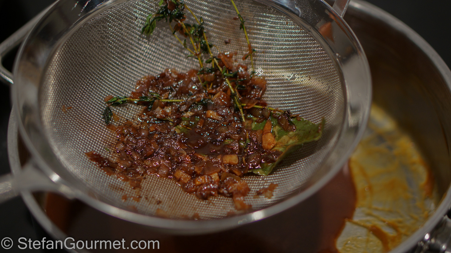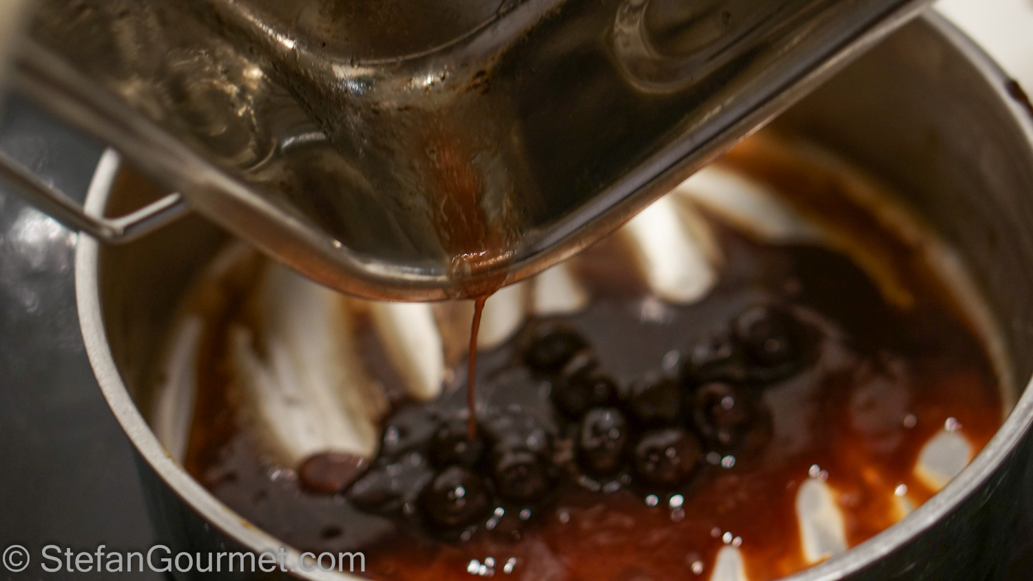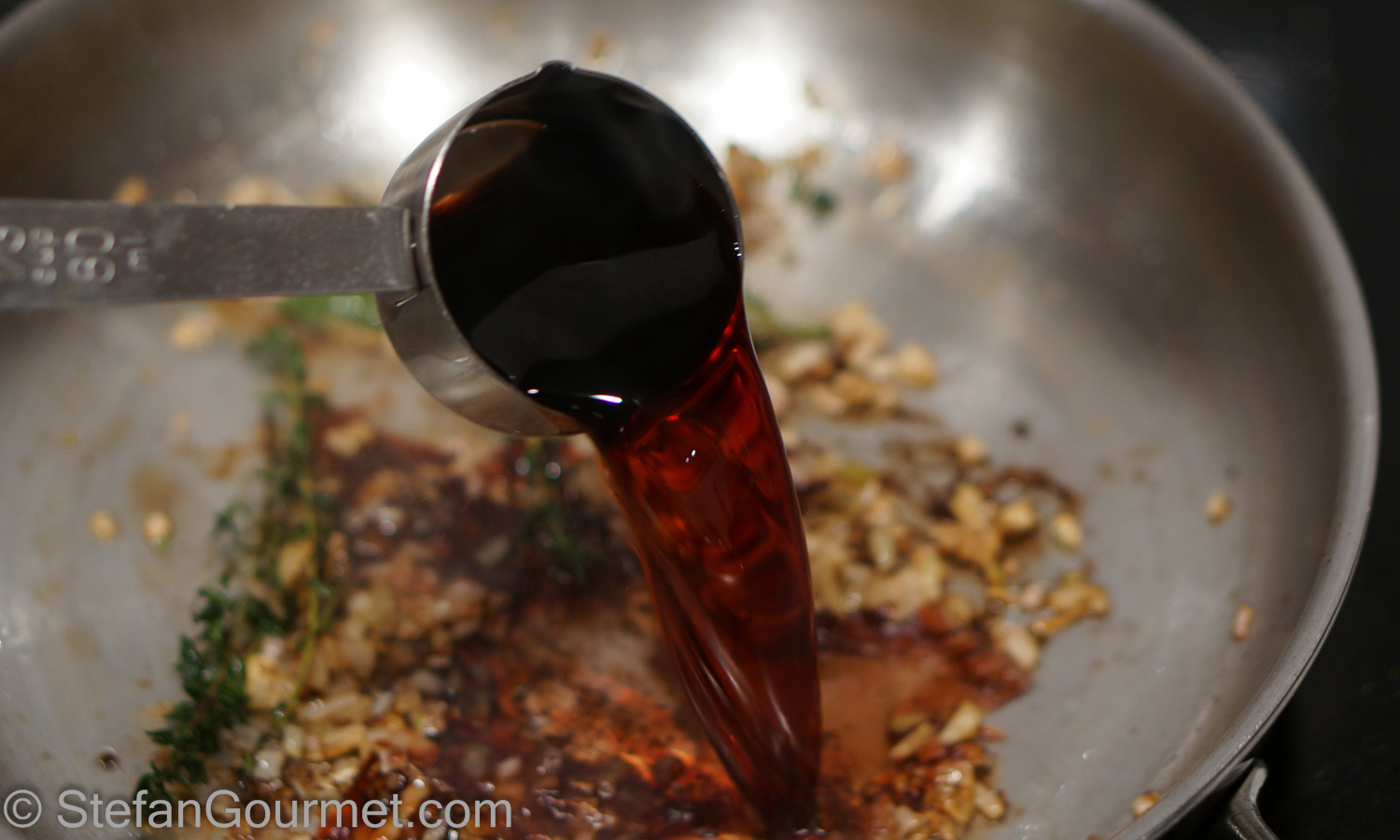 Deglaze with the port, scraping with a wooden spatula to include the browned bits into the sauce.