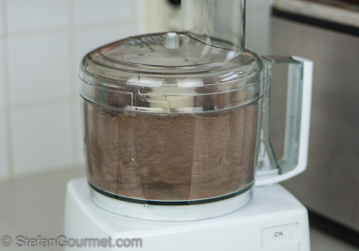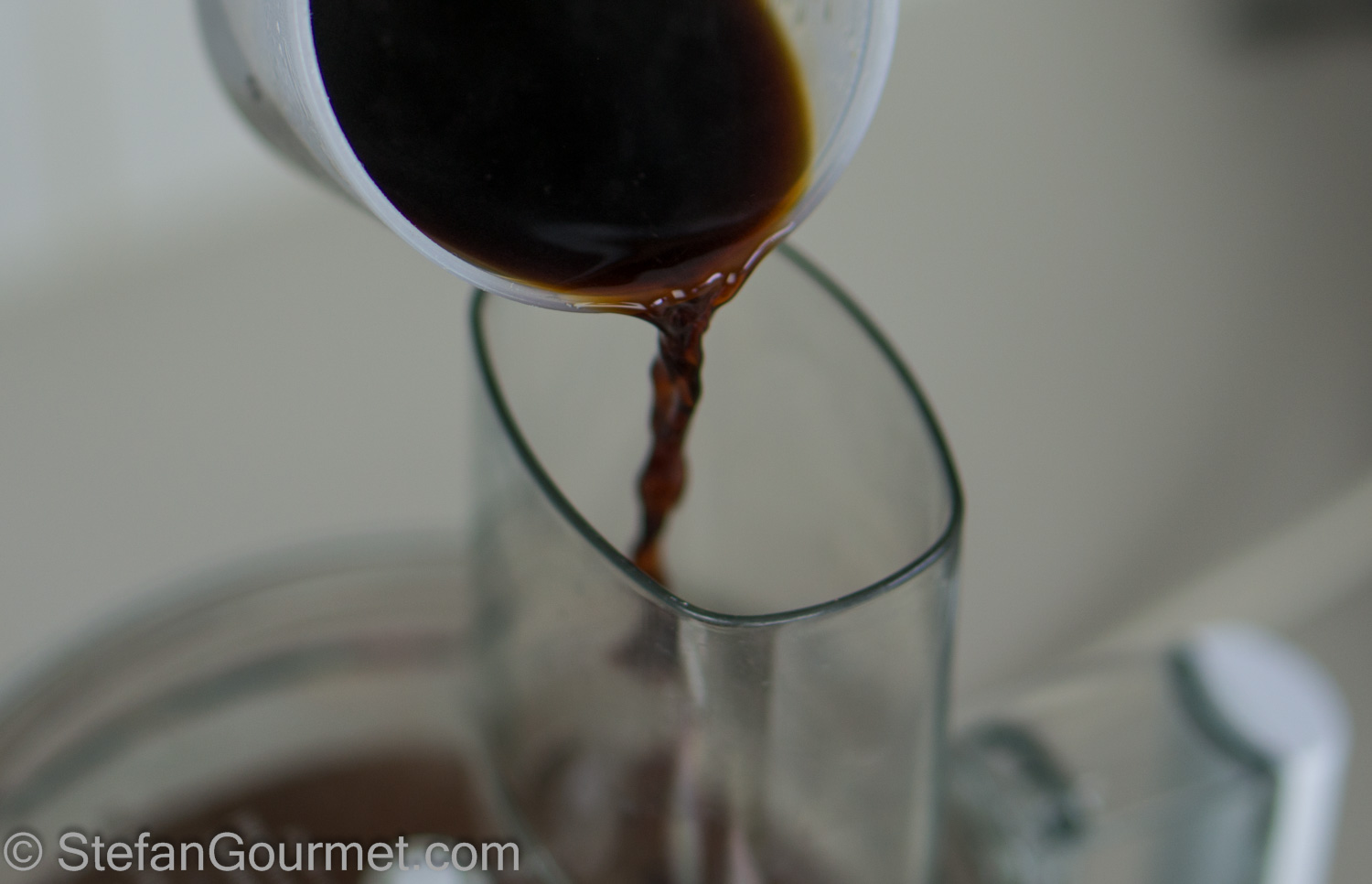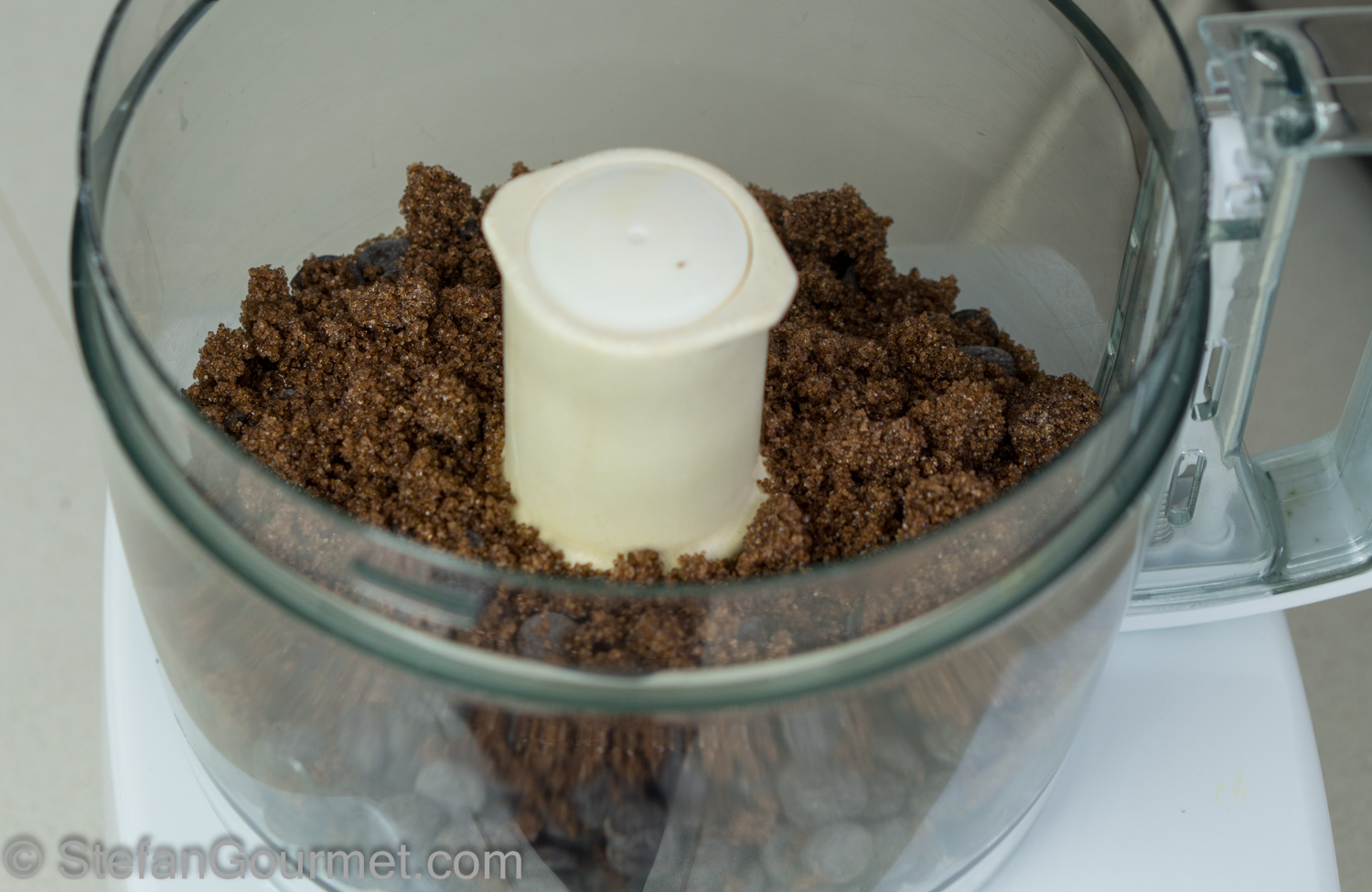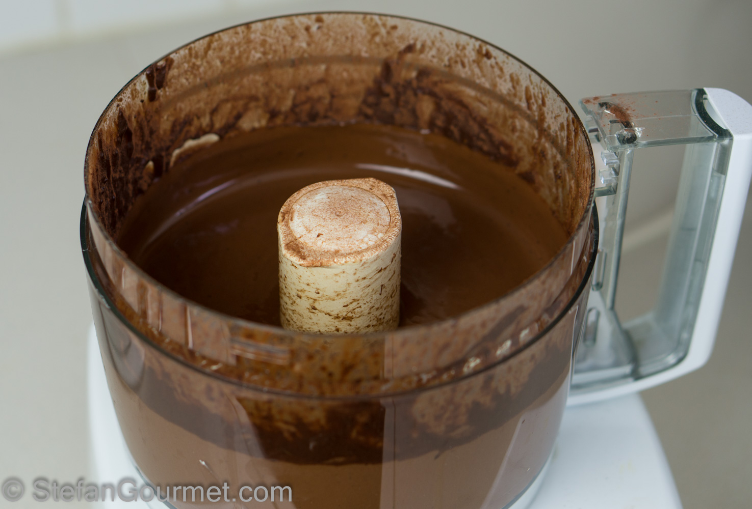 Once the chocolate is ground, add the hot espresso through the feeding tube with the motor running. (Heat it up in the microwave if needed.)