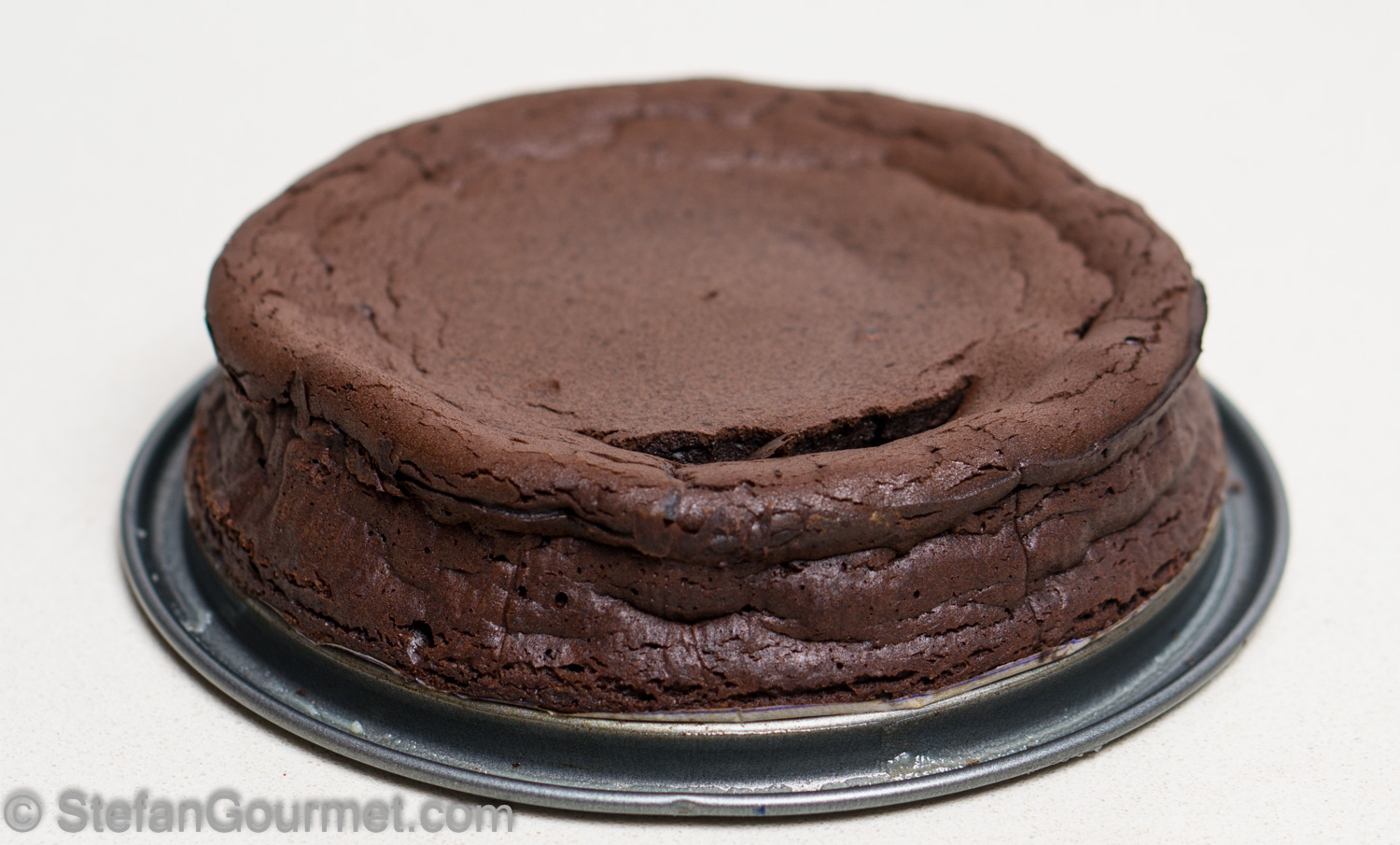 This flourless chocolate recipe is much easier than the recipe I posted before, and just as good. But, it is much easier. It does not require you to melt chocolate and butter, for which you need to regulate the heat very carefully, if you don’t have induction au bain marie. It does not require you to separate eggs, which is tricky because one tiny drop of yolk in the white will make it impossible to whip the egg whites into foam. It does not require you to whip any egg whites, which can be tricky because the bowl and beaters have to be very clean otherwise it won’t work. It doesn’t require you to gently fold the beaten egg whites into the batter, which is a pain in the ass.