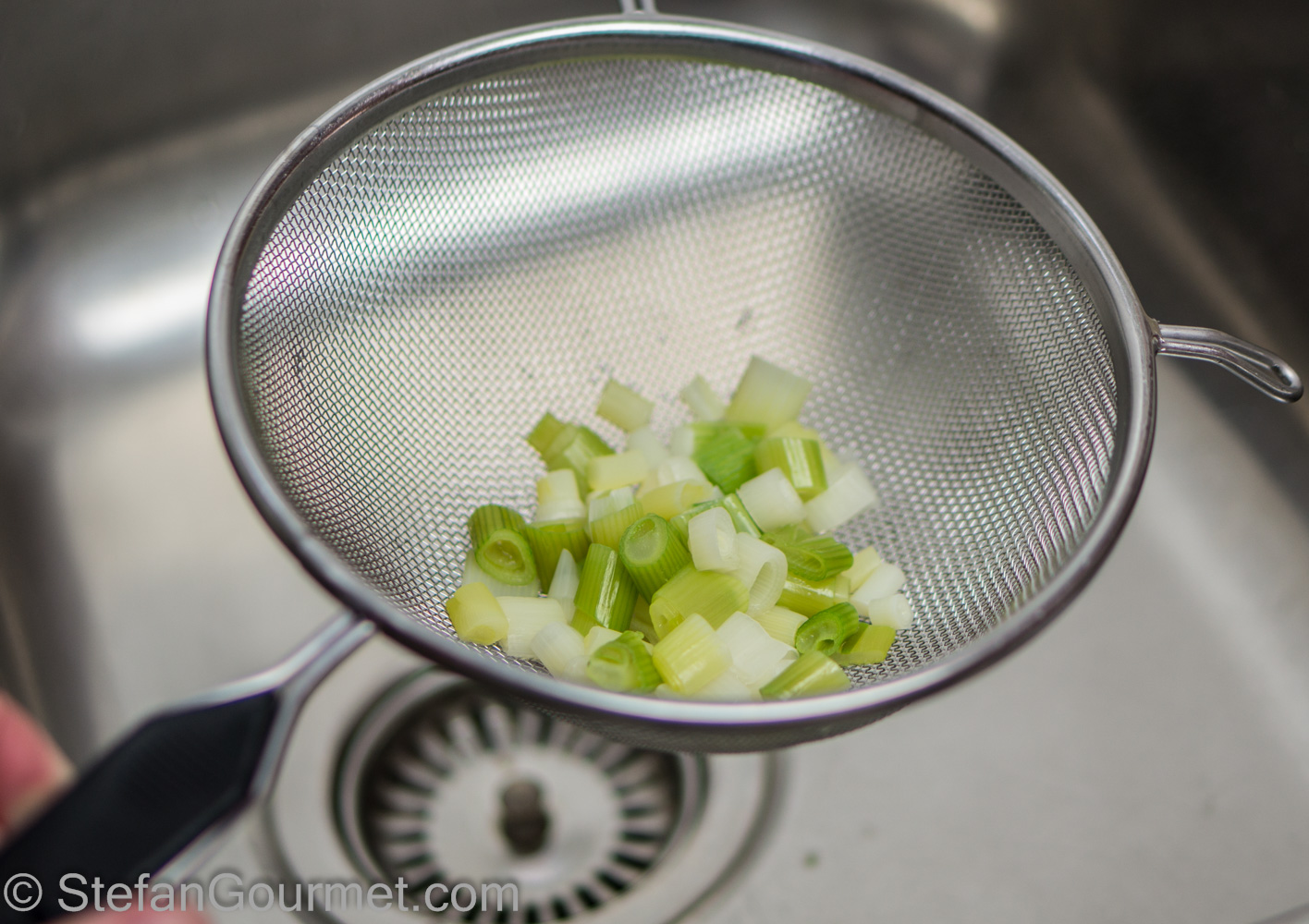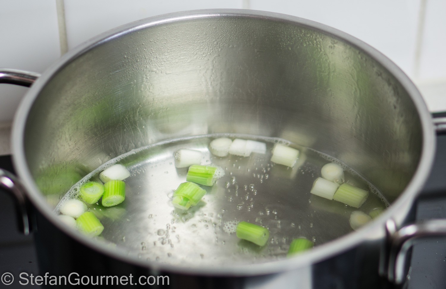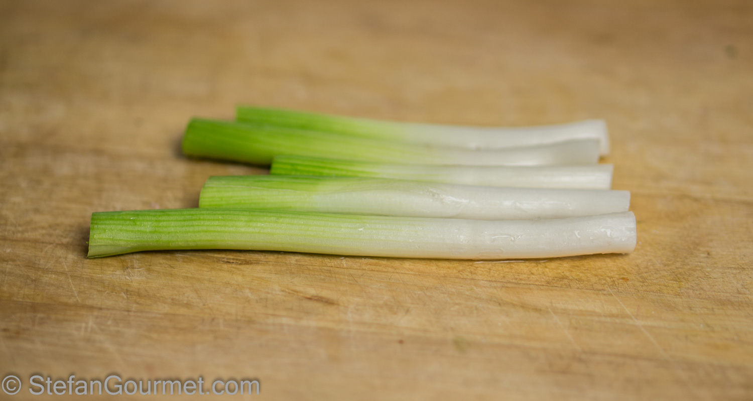 While the sugar hardens, make the cream of spring onions. Remove the roots and the darker green, keeping only the white and light green.