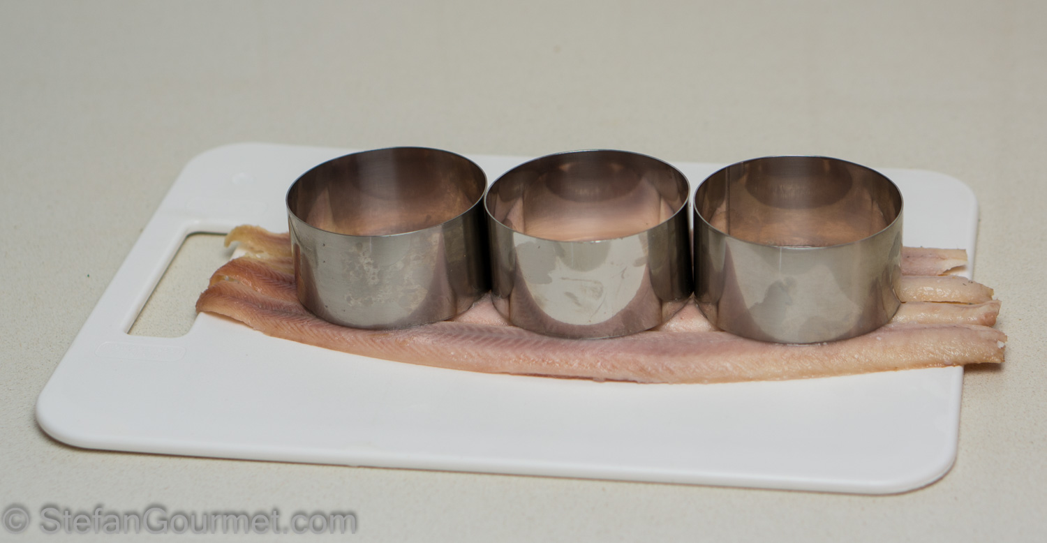 Select ring molds into which the apples fit snugly. Use the ring molds to cut out circles of smoked eel.