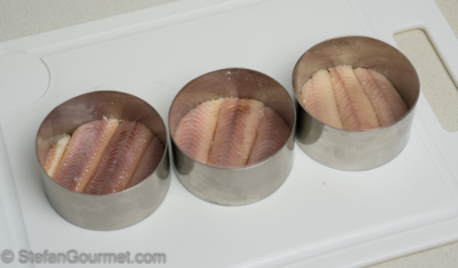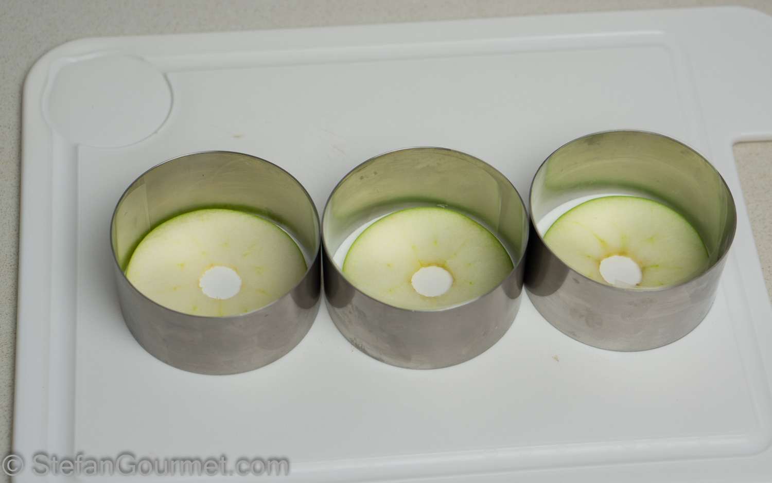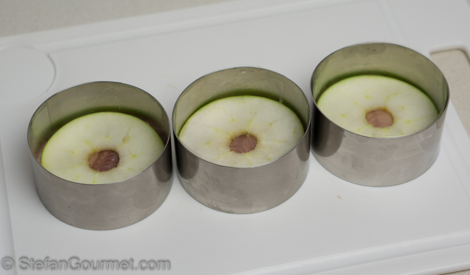 You are now ready to assemble. Arrange the ring molds on a cutting board. Put a slice of apple in each mold.