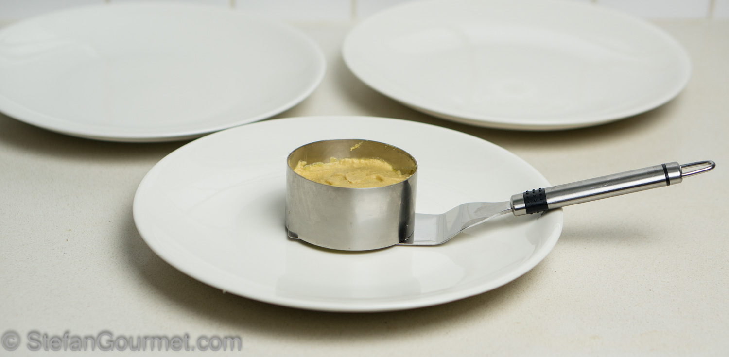 Once the cream of foie gras has firmed up, transfer the ring molds to serving plates. Carefully remove the ring molds, using a knife to cut along the inside to loosen the foie gras from the mold.