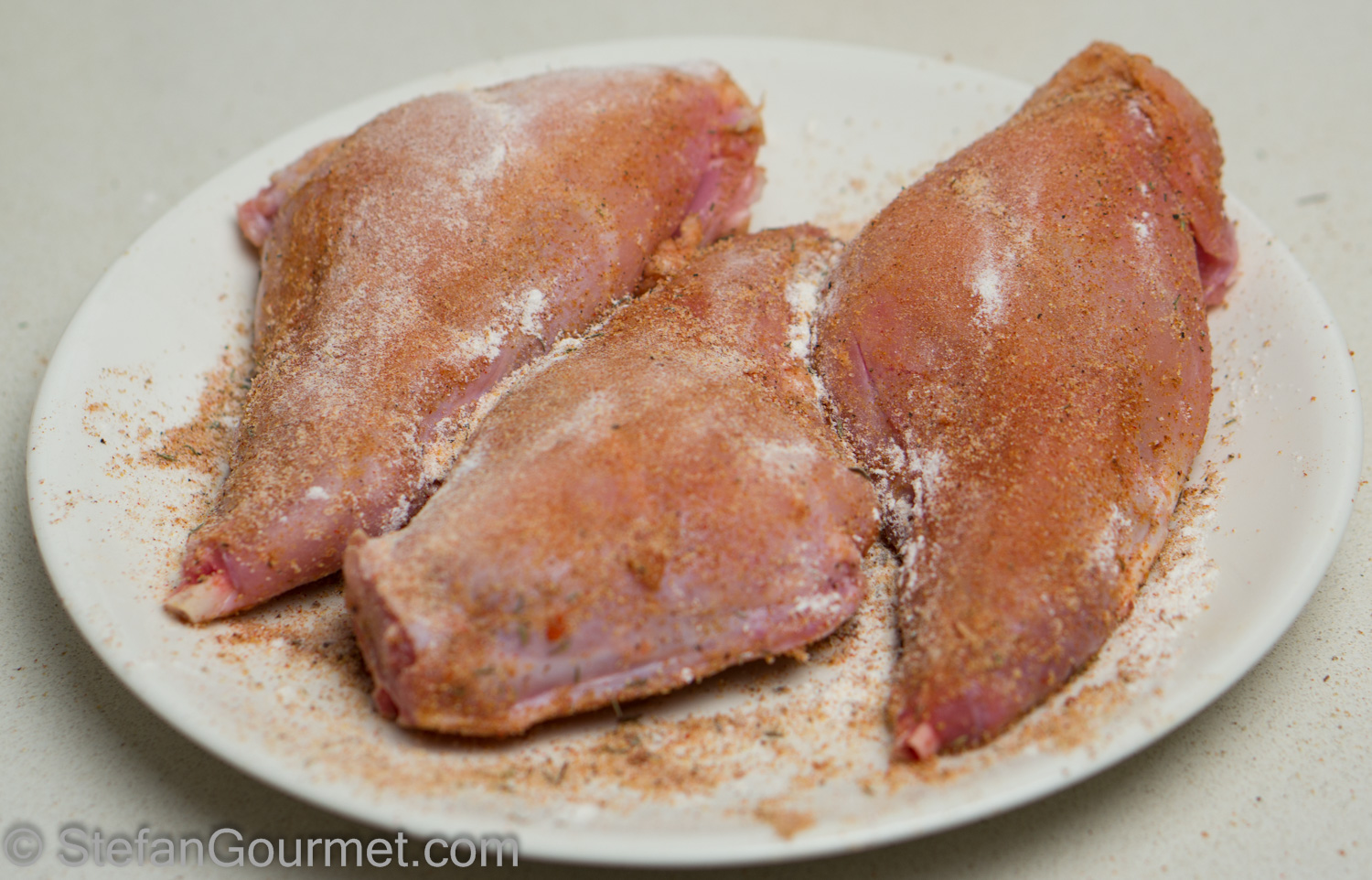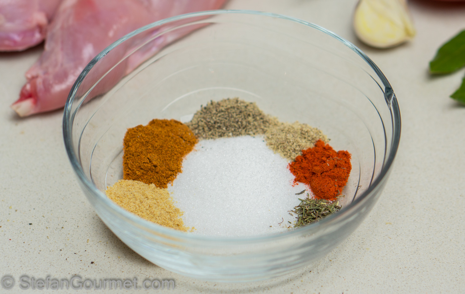Rub the rabbit legs on all sides with about 2/3 of the spice mix.
