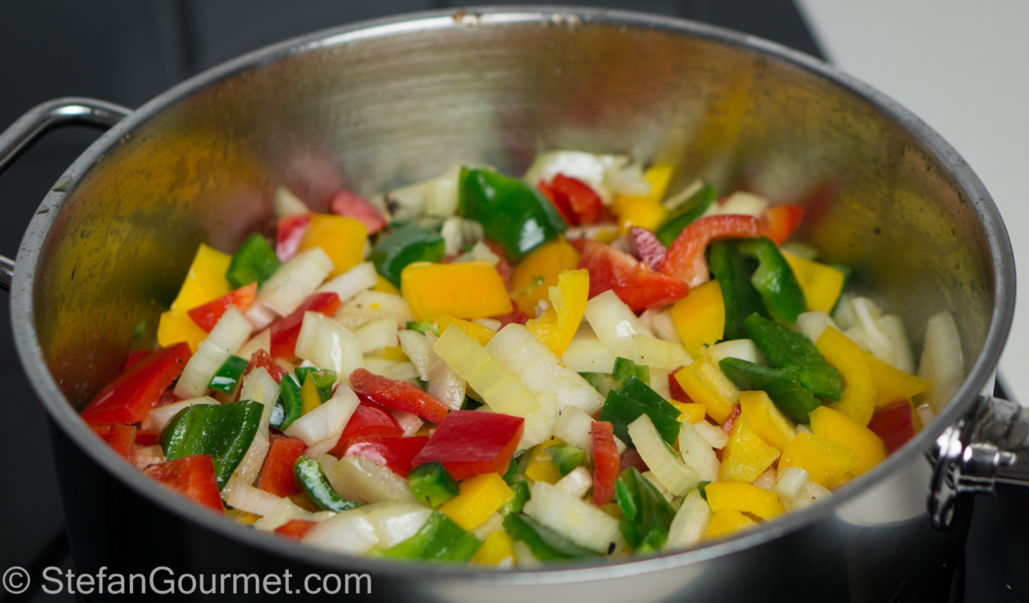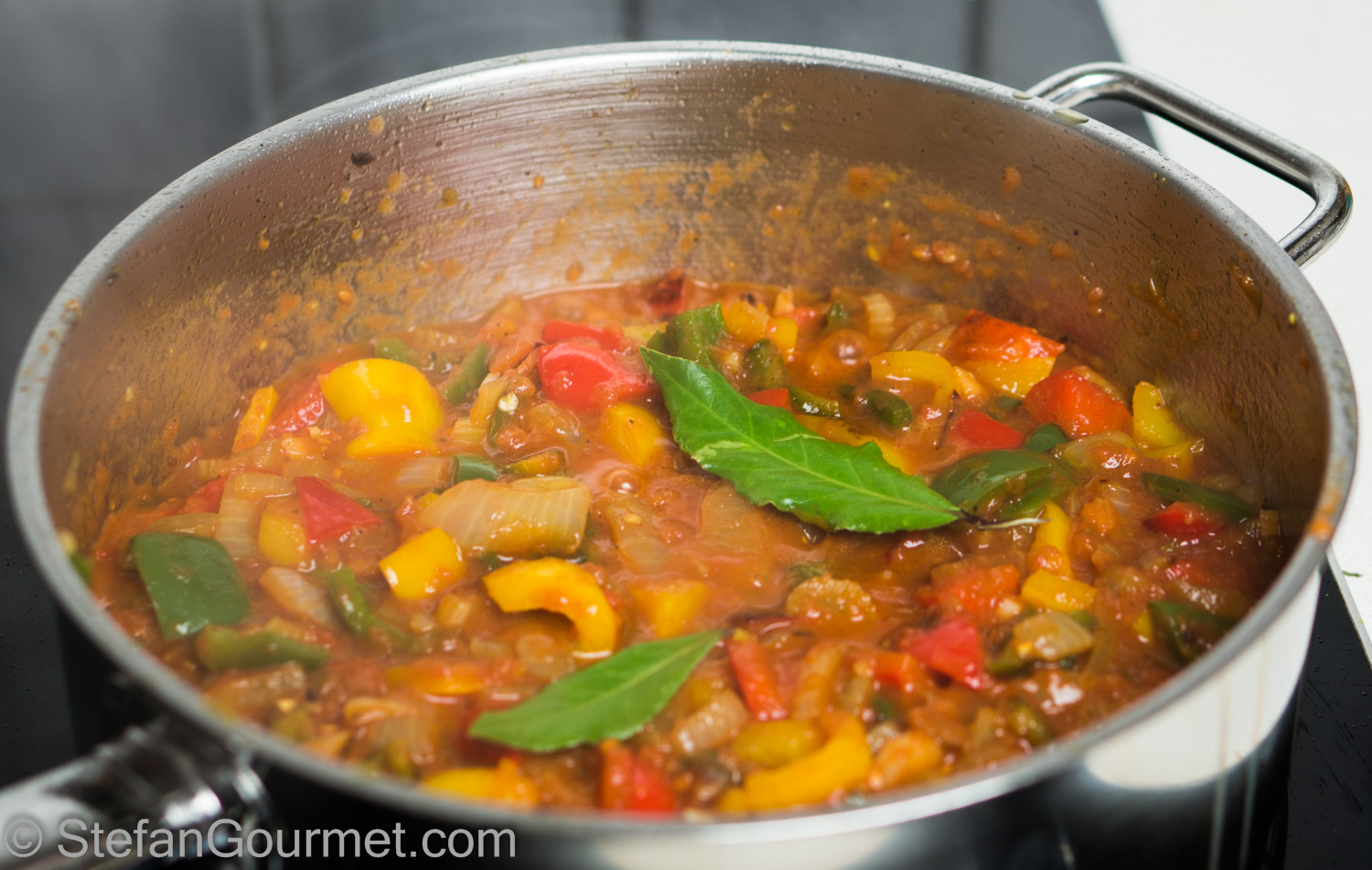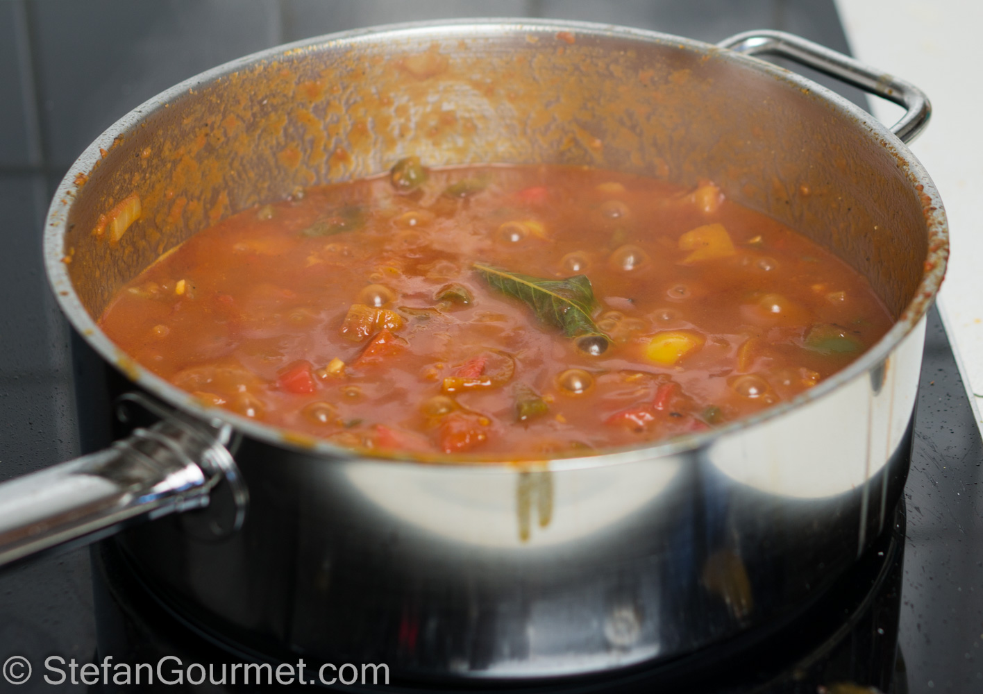 Bring to a boil, then lower the heat and allow to simmer, uncovered, until the sauce has a nice thick consistency and the vegetables are tender.