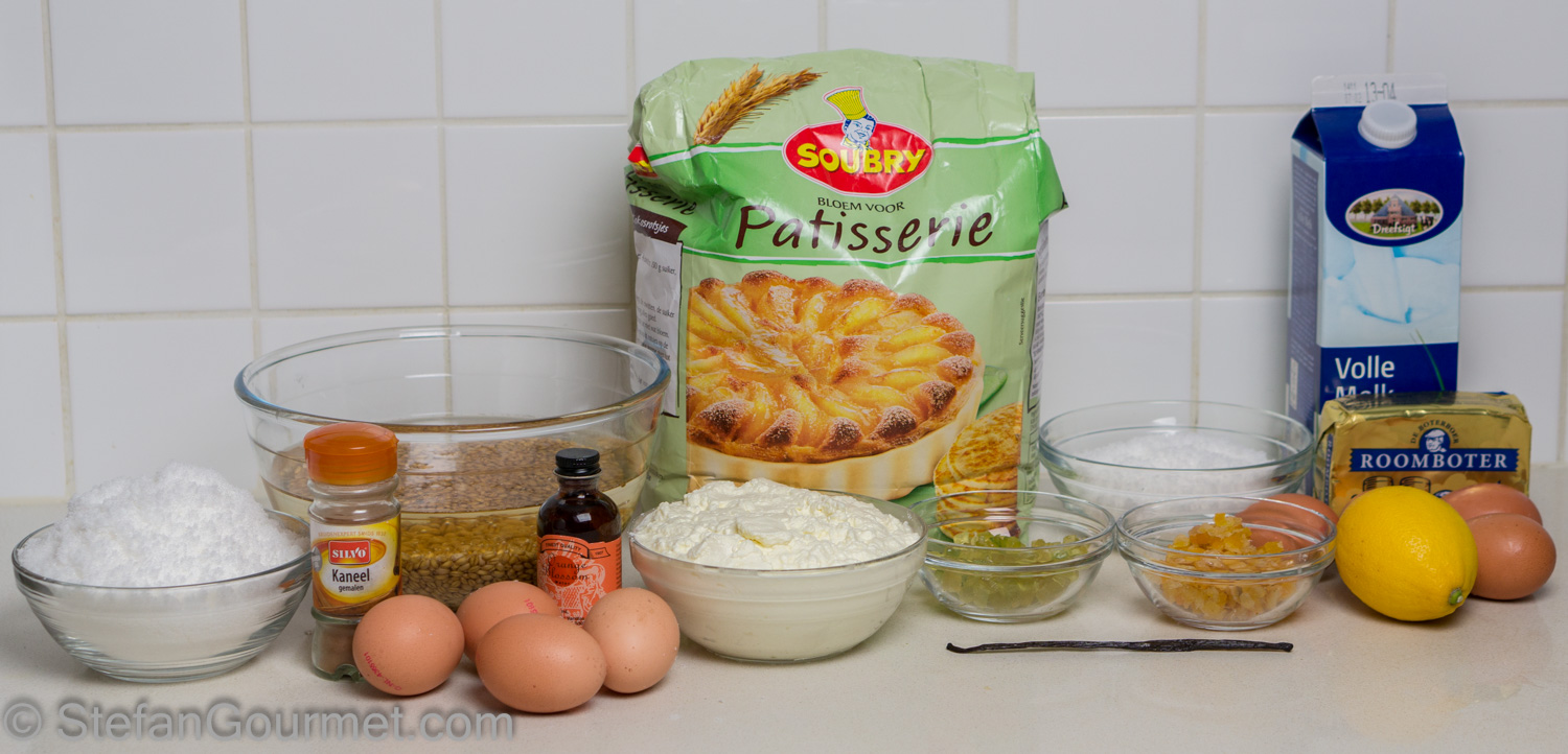 The hardest part of making this cake is to avoid that the ‘lattice’ of shortcrust pastry on top sinks into the filling. Next time I make this cake, I will allow the filling to firm up in the refrigerator to make this easier. I’ve used the recipe from GialloZafferano with some modifications, the most important one being that I cooked the wheat myself. The authentic pan for this is not a springform pan but a conical pan with a top diameter of 24 cm (9.4″) and a bottom diameter of 21 cm (8.3″).