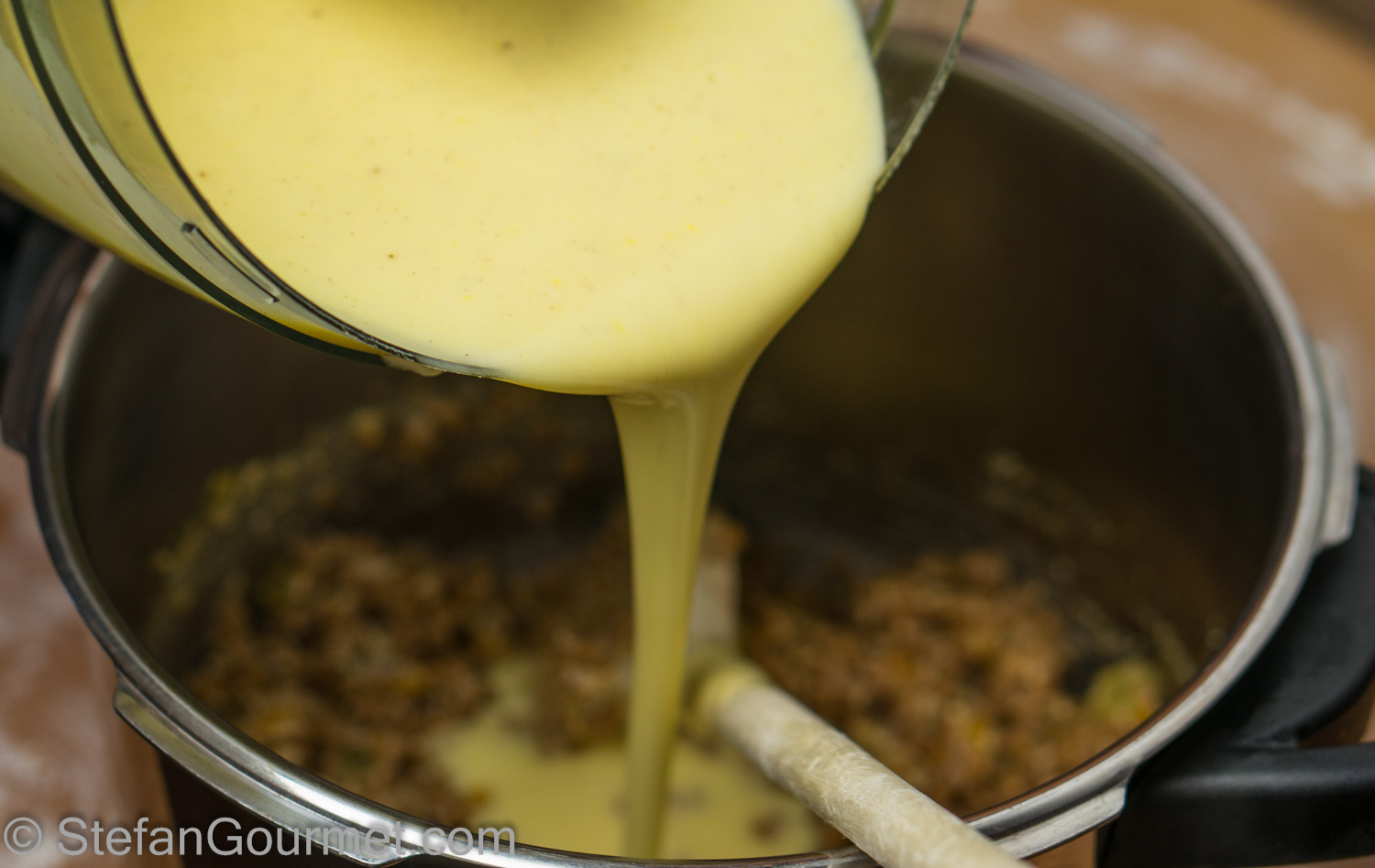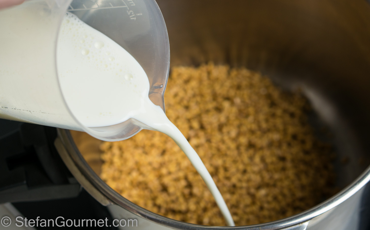 The following day, put the wheat in a pot or a pressure cooker and add the milk.