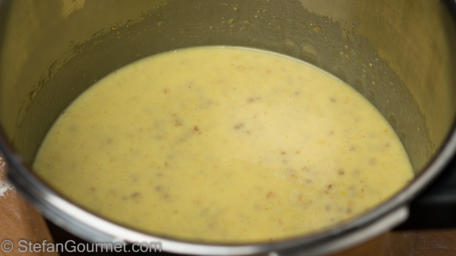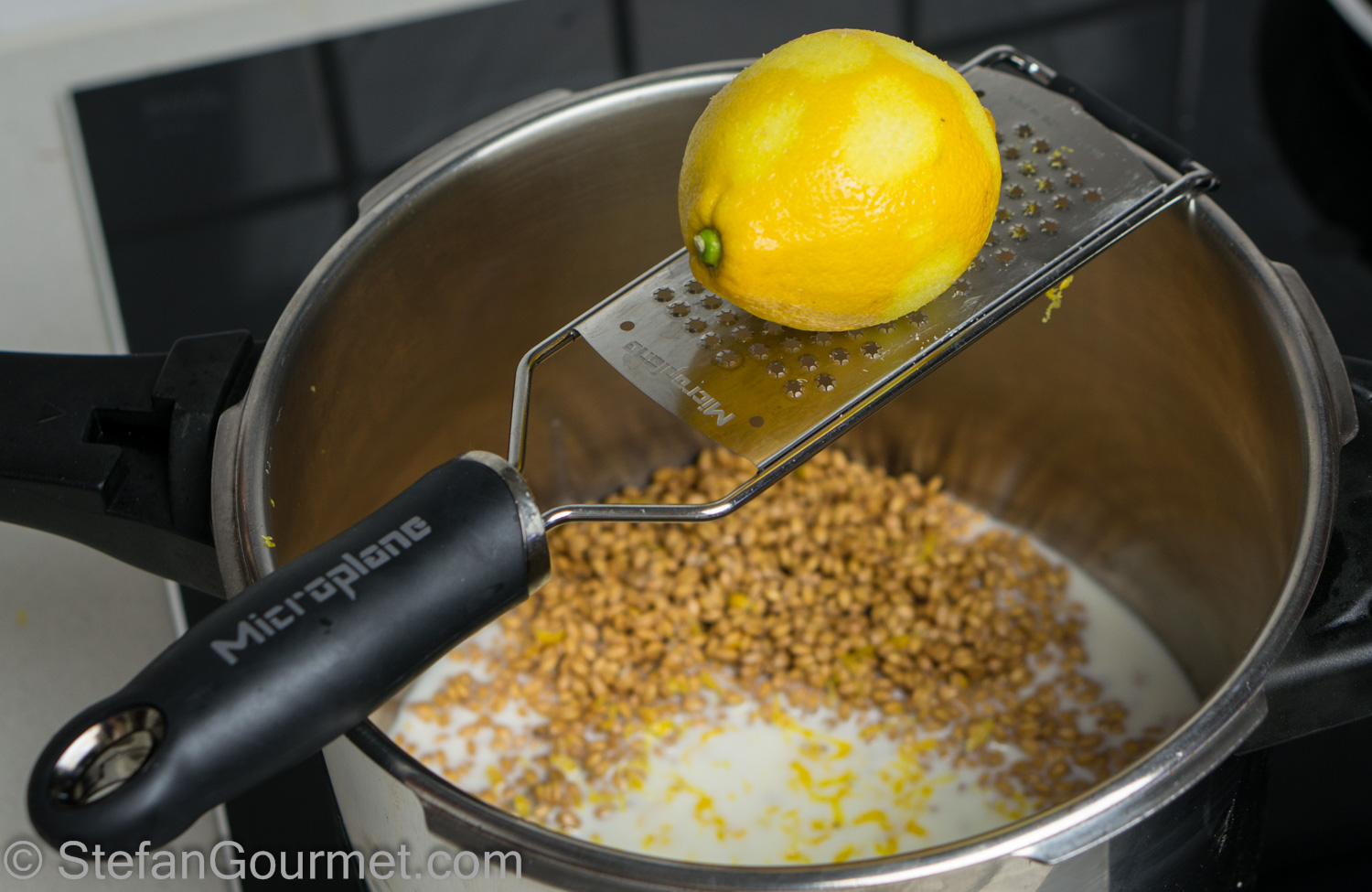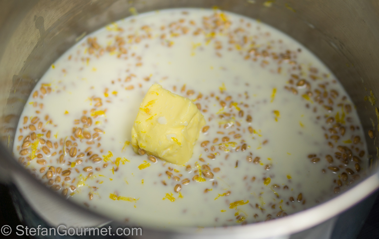 The wheat needs to be soaked at least 24 hours before it is cooked. When using durum wheat (the usual in Southern Italy), it needs to be soaked for 3 days and the water needs to be changed each morning and each evening. With our soft wheat, 24 hours is sufficient. The wheat is then cooked with milk, lemon zest, and butter until it is al dente. This takes about an hour and a half, or half that time with a pressure cooker. To cut down on the preparation time, in Italy the boiled wheat (grano cotto), is sold precooked. Since it is not available here, I made my own from scratch.
