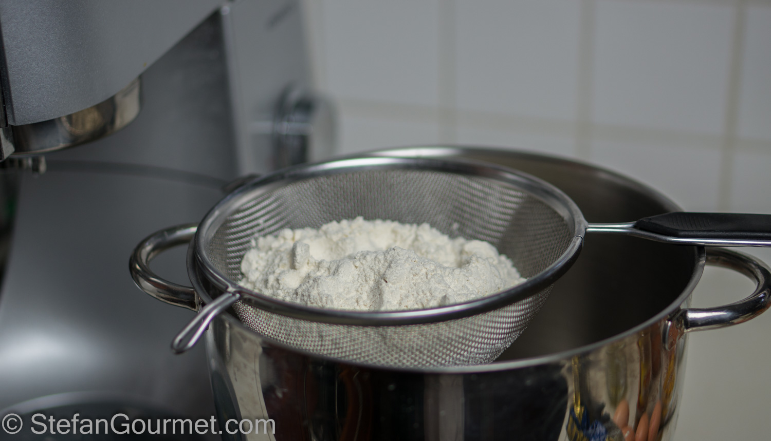 While the wheat is cooking, make the pasta frolla (sweet shortcrust pastry). Sift the flour into the bowl of a stand mixer fitted with the paddle attachment. Add the sugar.